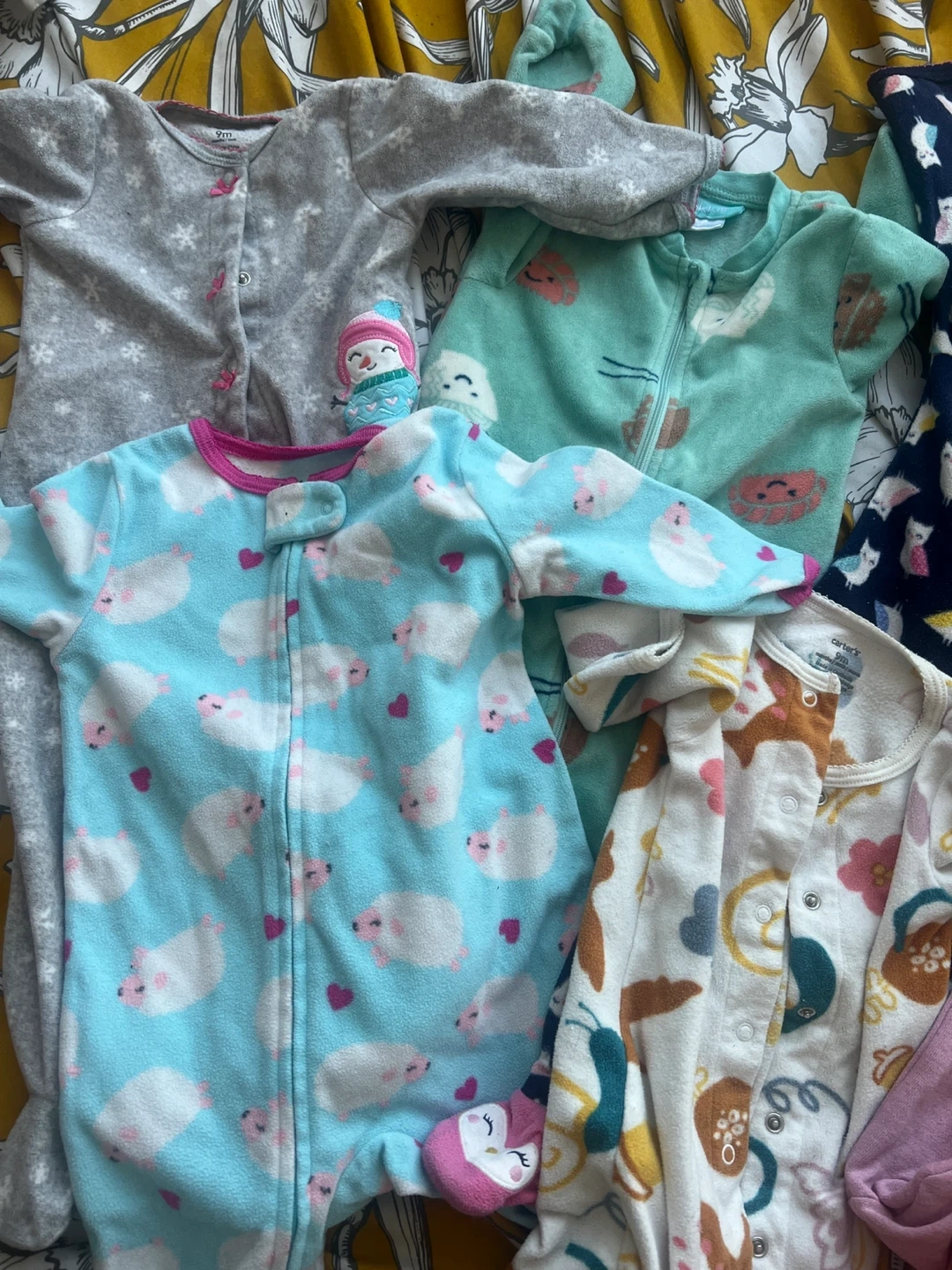 Bundle of 9 baby sleepers. Sleepers include various fun prints like sheep and owls, with zipper and snap closures. The Gap hooded onsie is pink with a zip-up front. All items are soft fleece material.