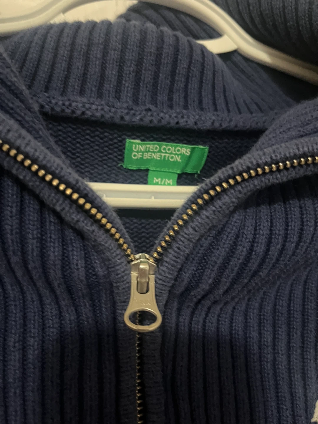 This United Colors of Benetton sweater features a classic navy and white stripe pattern with a quarter-zip collar. It's a size M/M. Made from knit material for comfort and warmth.