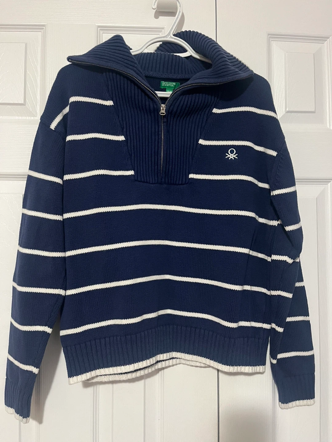 This United Colors of Benetton sweater features a classic navy and white stripe pattern with a quarter-zip collar. It's a size M/M. Made from knit material for comfort and warmth.