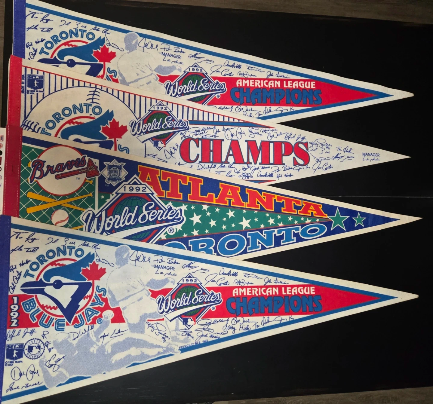 This is a collection of four pennants celebrating the 1992 World Series. It includes pennants for the Toronto Blue Jays, Atlanta Braves, and two general American League Champions pennants. These commemorate the historic championship win for the Toronto Blue Jays. Great for any baseball fan! ASKING $60 FIRM FOR ALL FOUR