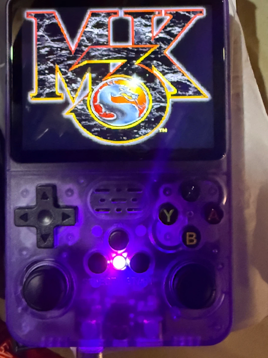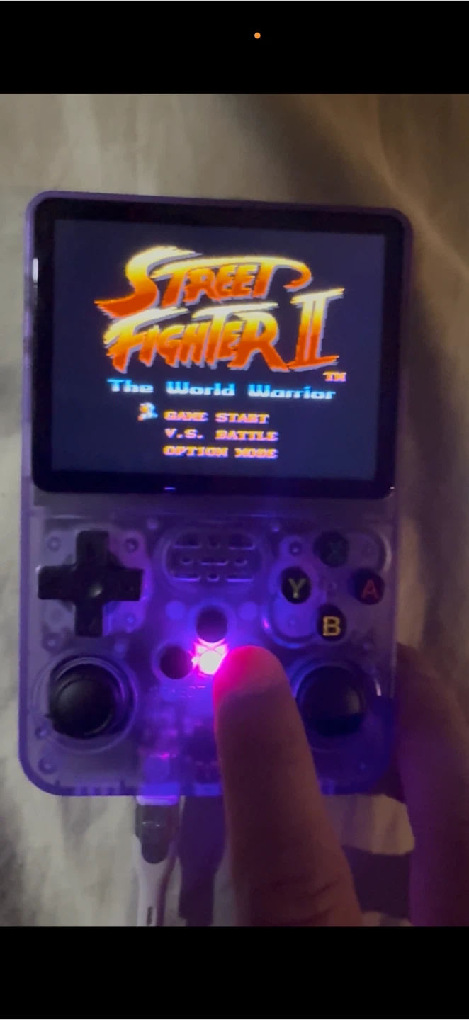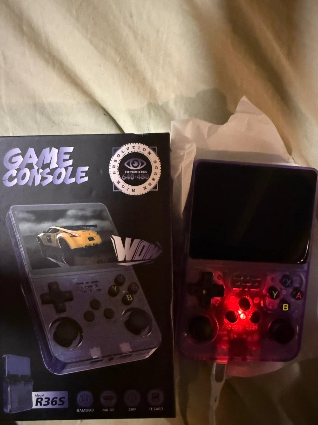 This is a purple retro game console, model R36S. It features a screen with eye protection and is ready for gaming. Comes with original box. Great for retro gaming fans!