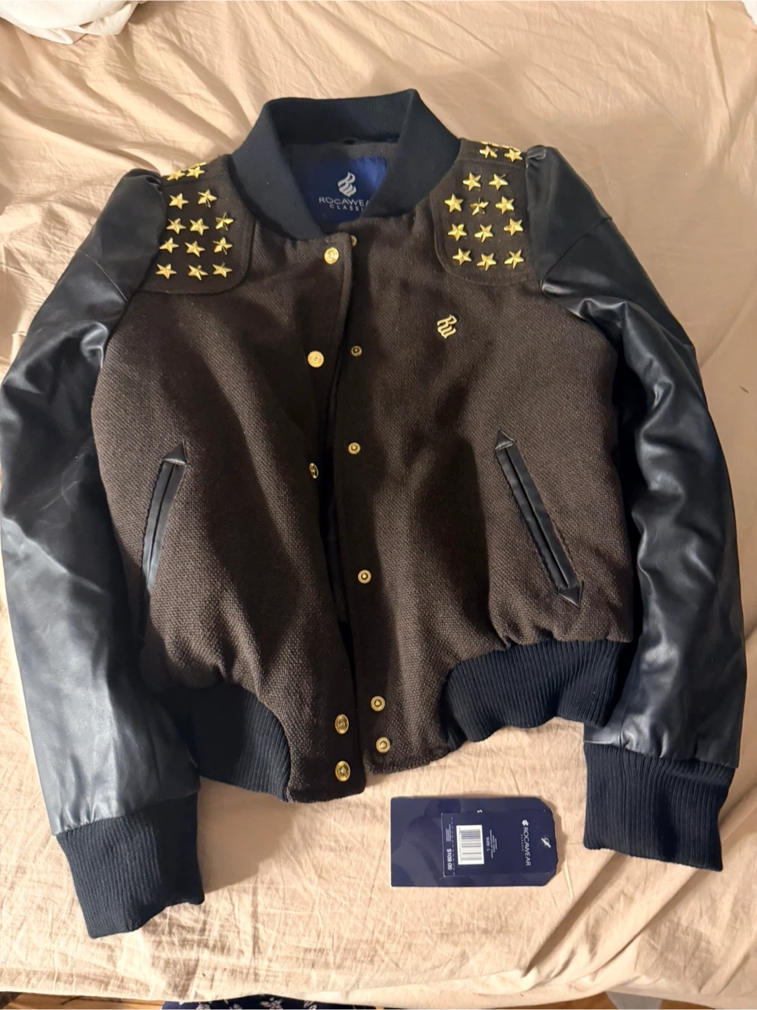 This Rocawear varsity jacket features a brown tweed-like body with black faux leather sleeves and gold star accents on the shoulders. It has a snap button closure and ribbed cuffs and hem. Gold buttons.
