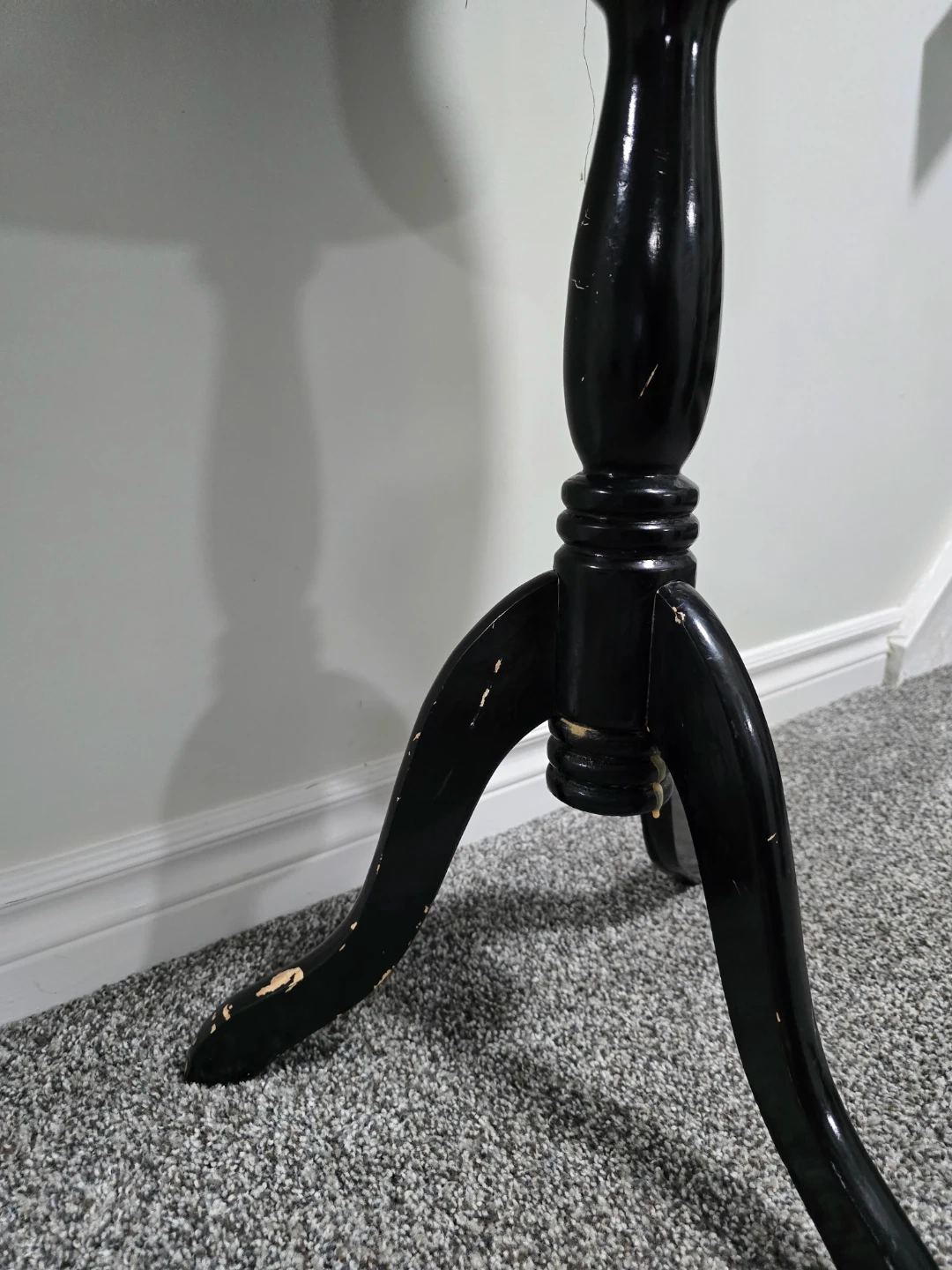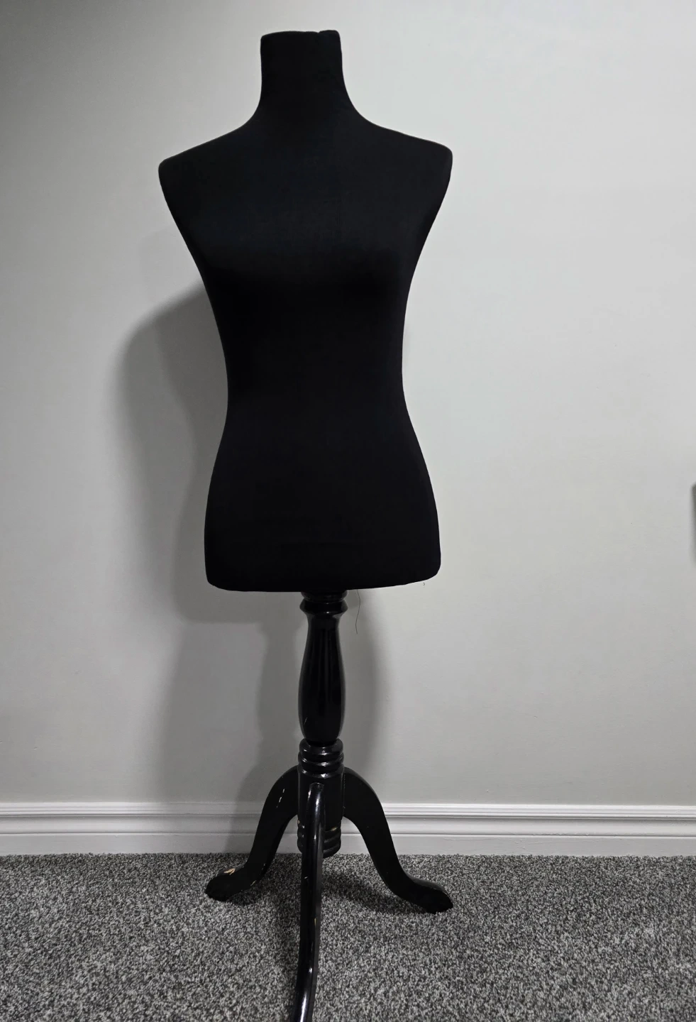 This is a black fabric dress form mannequin with a wooden base. It's ideal for displaying clothing. The base is black wood and has some wear.