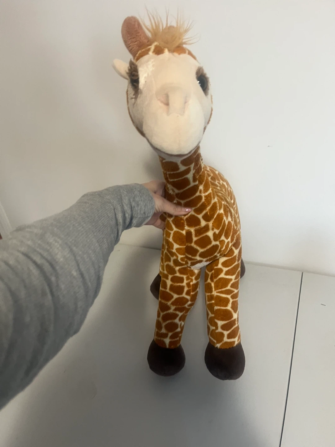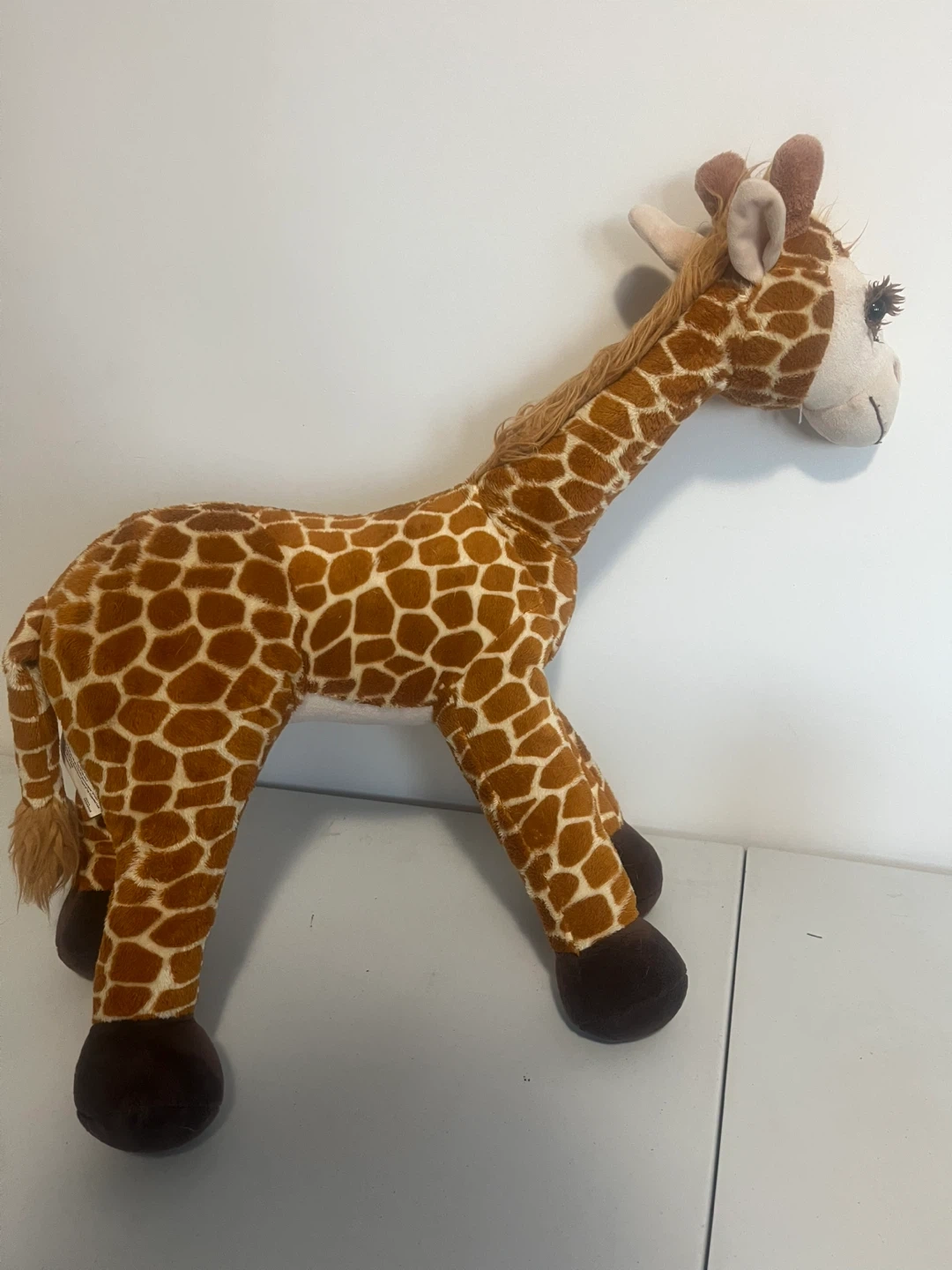 A soft plush giraffe toy with distinctive brown and tan spots. It's designed with long legs and a friendly face. This stuffed animal is great for playtime or as a cuddly companion.