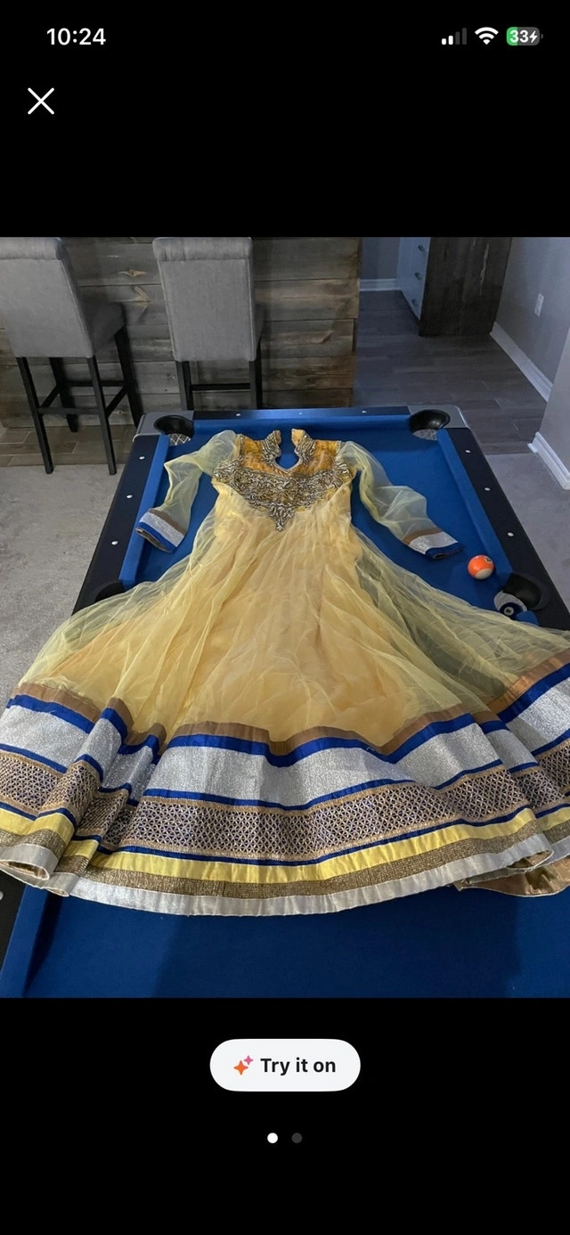 This beautiful Anarkali dress features intricate detailing and a flowing silhouette. The dress is adorned with delicate embellishments and is perfect for special occasions or festive events. Additional details: - Colour: Yellow and Blue - Fabric: Lightweight material - Size: Approximately a size Medium (8-10) - Condition: Gently worn, good condition. If the ad is up, the dress is available!