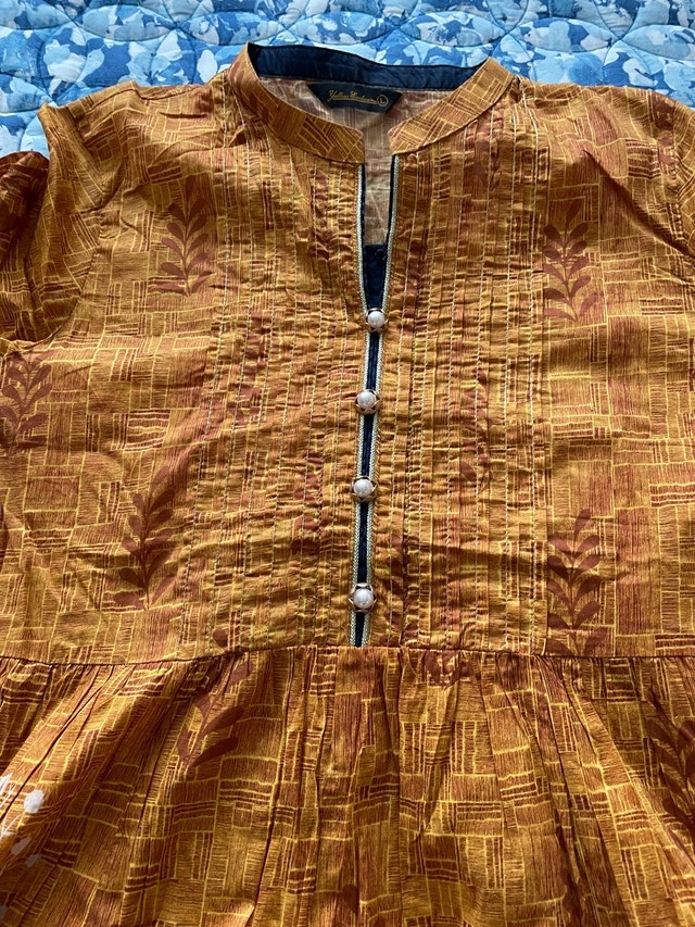 Elevate your wardrobe with this stunning, used ethnic dress, featuring a vibrant floral pattern in shades of blues and pinks on an gold/mustard background, perfect for adding a touch of cultural flair to any occasion. Size Large (12-14). Cash accepted.