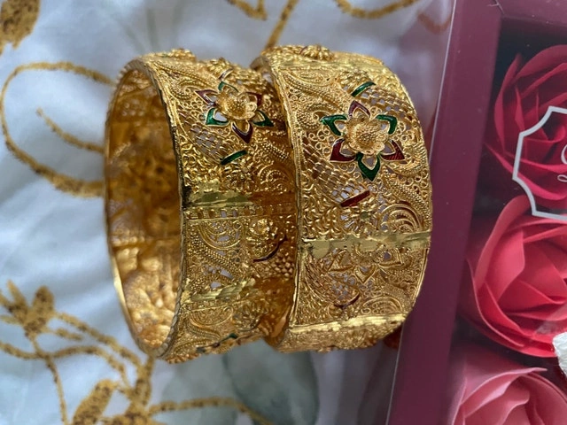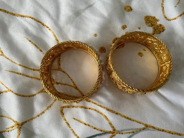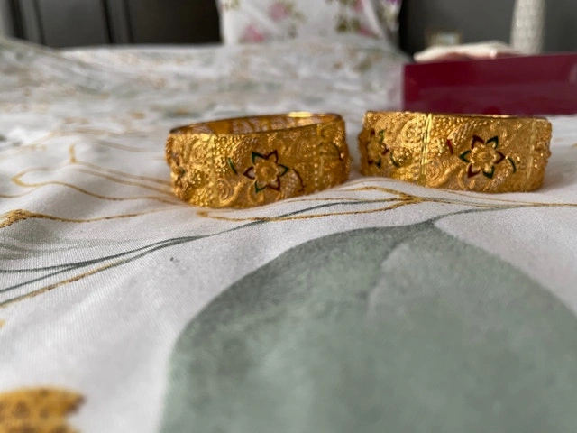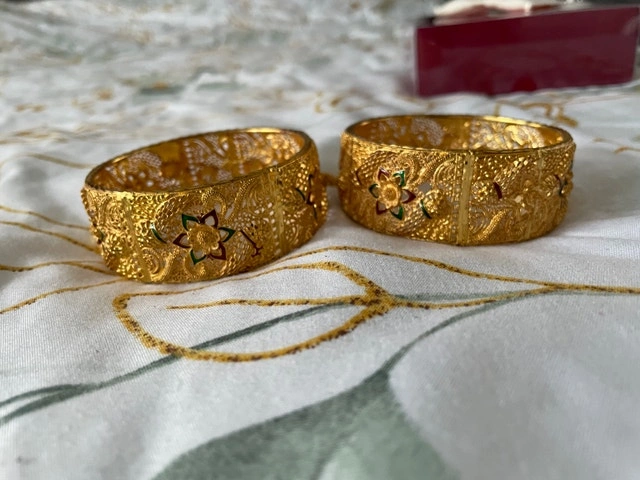These ornate gold bangles are a beautiful addition to any jewellery collection, featuring intricate detailing and a vibrant floral pattern. Used - Like new. Owner selling. Curbside pick up available.