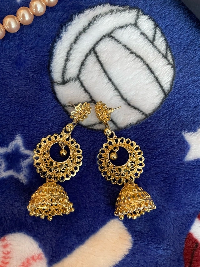 These used gold jhumka earrings feature a traditional bell shape with intricate filigree detailing, perfect for adding a touch of cultural elegance to any outfit. Condition: Used - Good. Cash accepted.
