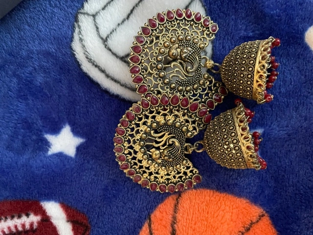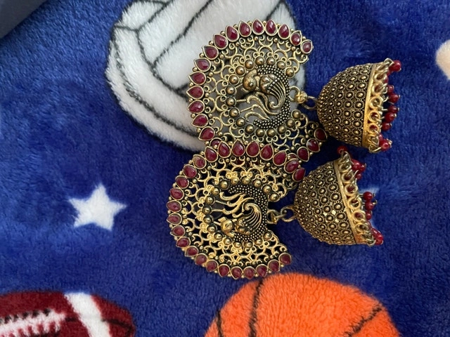 These used Jhumka earrings feature a gold tone with beautiful magenta stones, perfect for adding a touch of elegance to any outfit. Although they are used, they are in good condition and ready to be worn. If this ad is still up, then yes, it's still available! Cash accepted.