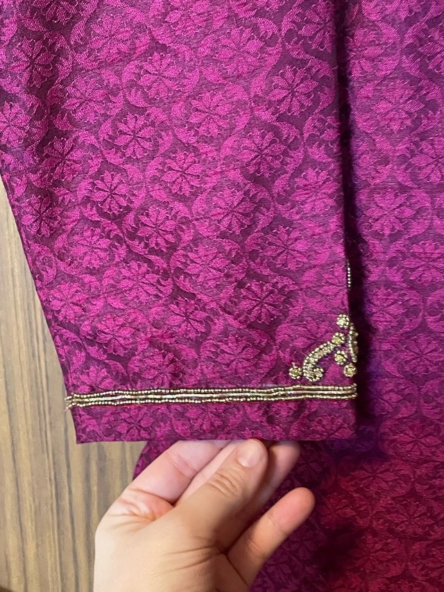 This exquisite men's kurta, adorned with intricate gold and red detailing, is perfect for special occasions! While it has been worn, it remains in great condition, ready to make a statement at your next event. The luxurious fabric and detailed embroidery speak volumes of its quality. Size: Large. Cash accepted.