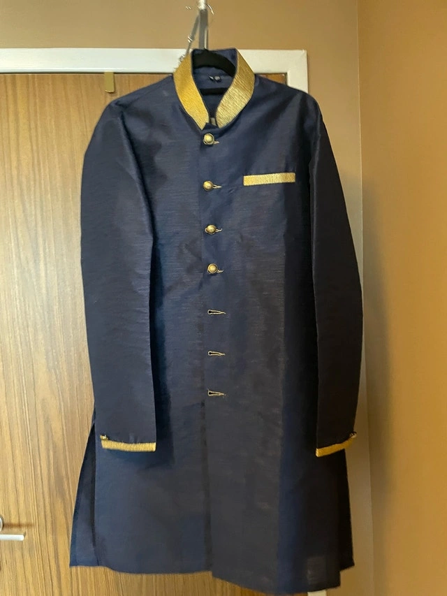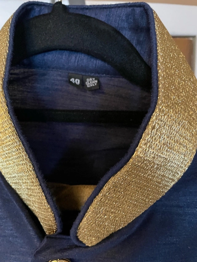 This elegant Sherwani features intricate gold detailing and is in excellent condition, perfect for special occasions. It is a size 40, designed for a sophisticated and comfortable fit. Key Features: Size: 40 Colour: Navy Blue Detailing: Gold accents on collar, buttons, and cuffs Condition: Gently worn, excellent condition. Cash accepted. Curbside pick up available.