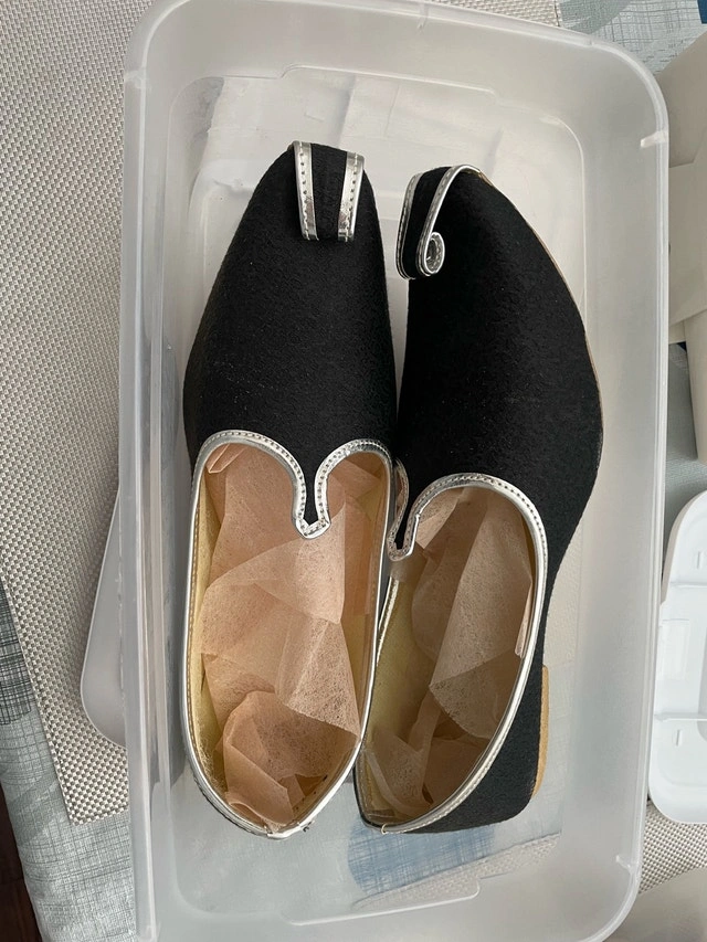 Step into style with these gently worn traditional shoes, perfect for adding a touch of elegance to any outfit. These shoes have been previously loved, but are still in great condition. The shoes are black with silver accents. They are perfect for any special occasion! As a reminder, if the ad is still up, the shoes are still available!