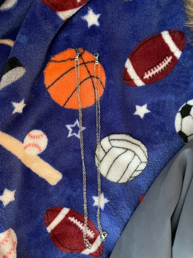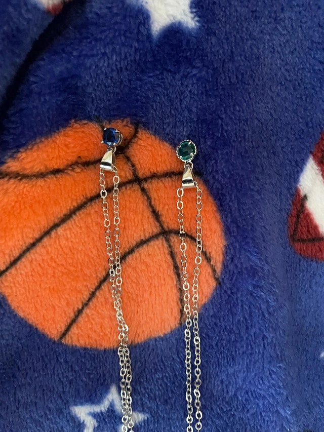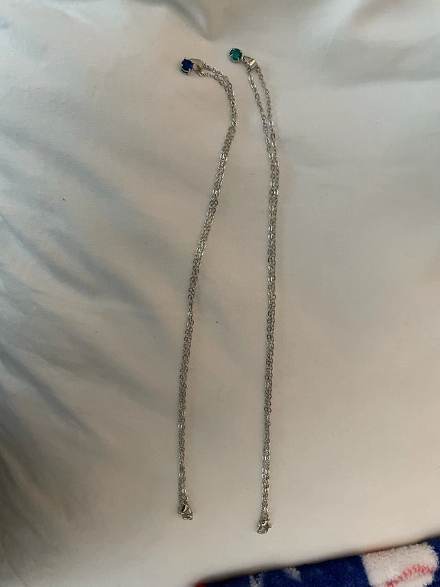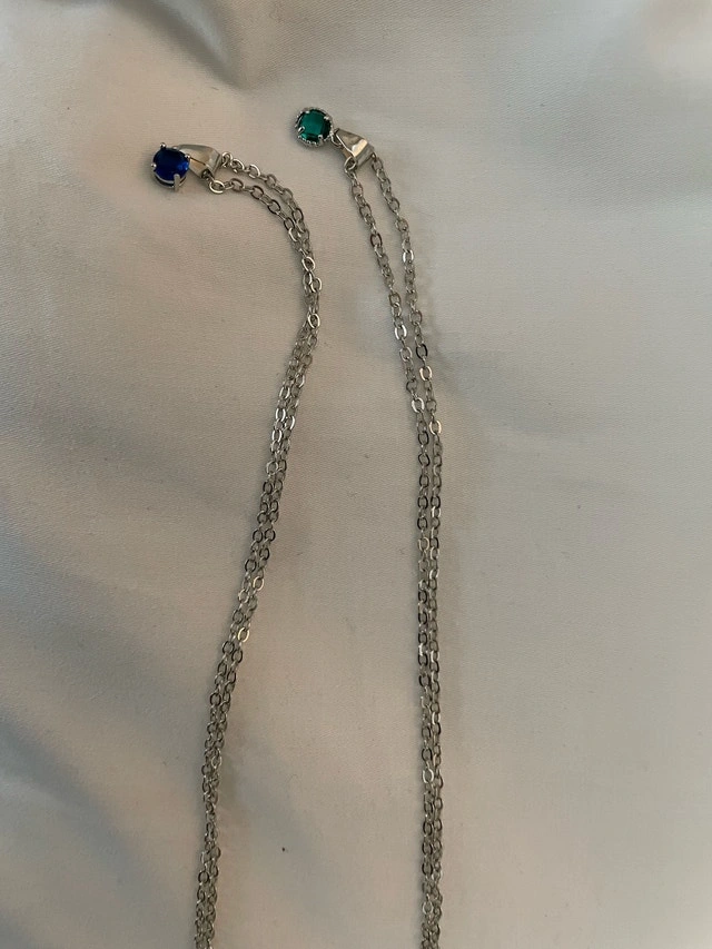 These elegant necklaces feature a delicate silver chain design, each adorned with a small, vibrant gemstone in blue and green. They come with a holder each. These are in like new condition.