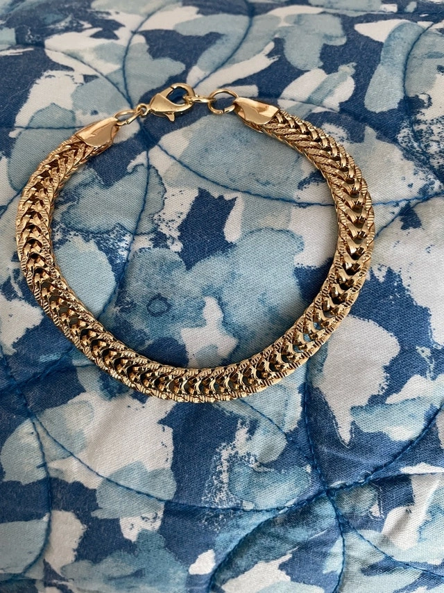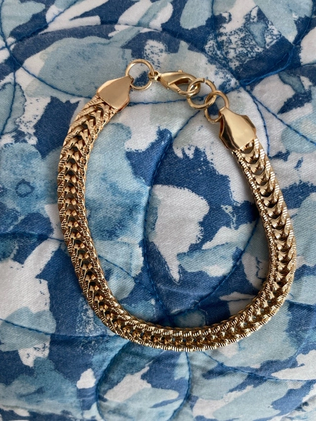 Check out this stylish gold bracelet! It's in good condition, as you can see from the pictures. This bracelet is the perfect accessory to add a touch of class to any outfit. If the ad's still up, it's still up for grabs. Cash accepted.