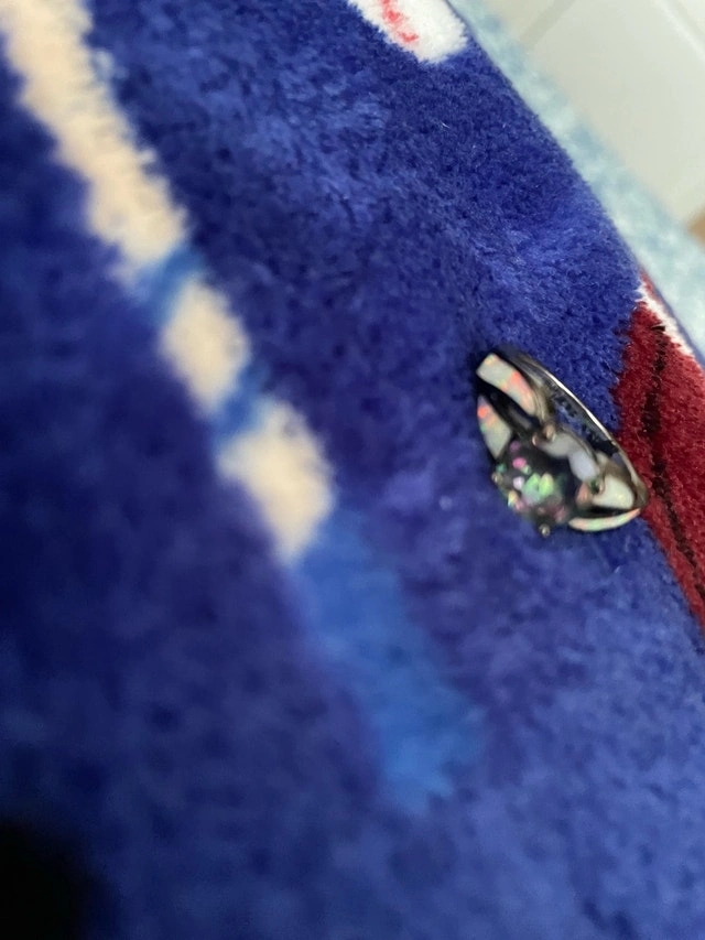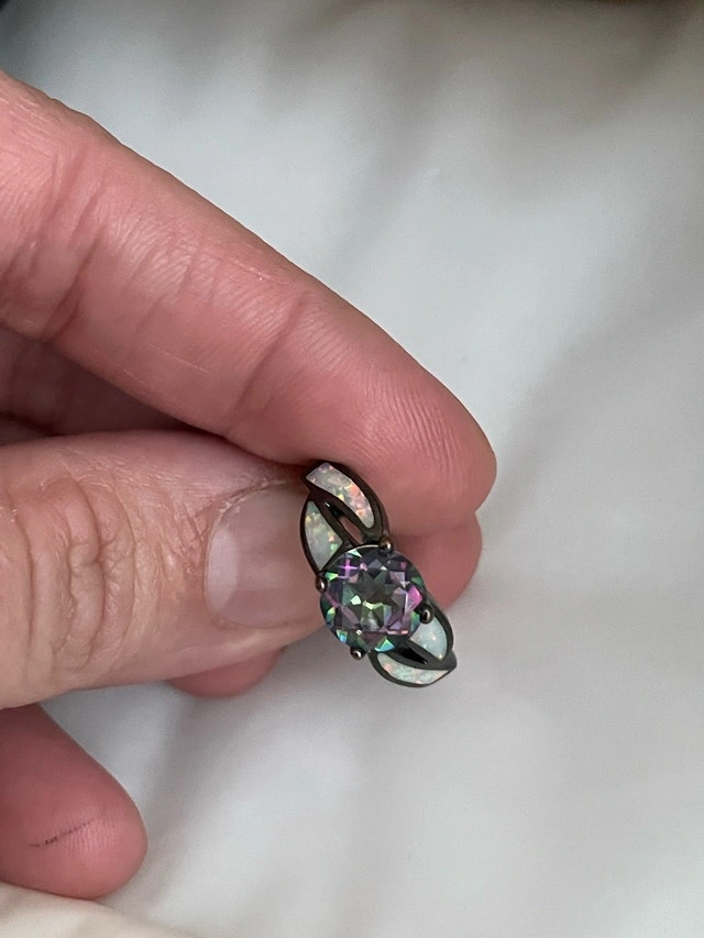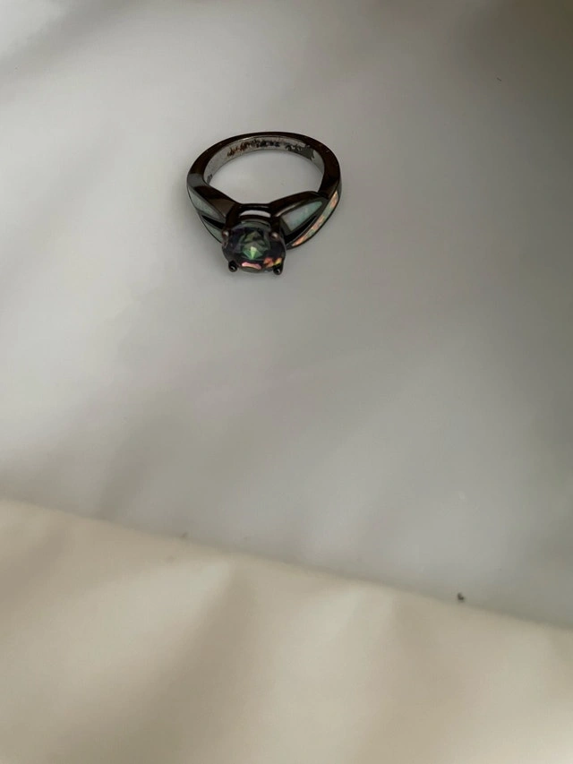 Add a touch of magic to your ensemble with this captivating ring, showcasing a mesmerizing mystic topaz stone complemented by iridescent opal accents, all set in a sleek, dark metal band. This ring is in used condition and has been worn with care. Stone: Mystic Topaz. Accents: Opal. Metal: Dark Metal. Looking for a little sparkle to brighten your day? Well, you've found it! And just so you know, if the ad is up, it's still waiting to find its way to you! Based on similar rings listed on Kijiji, a fair price for this ring is $25. Cash accepted.
