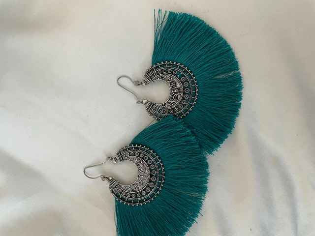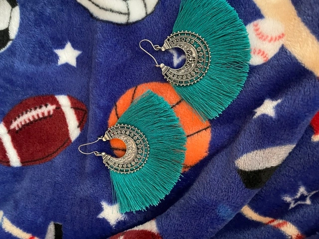 Add a touch of bohemian flair to your look with these stylish tassel earrings! These earrings feature a unique silver-tone half-moon stud design with vibrant turquoise-green tassels, perfect for accessorizing any outfit. These are previously owned and have been gently worn. Silver-Tone Studs Turquoise-Green Tassels. If the ad is up, the earrings are available!