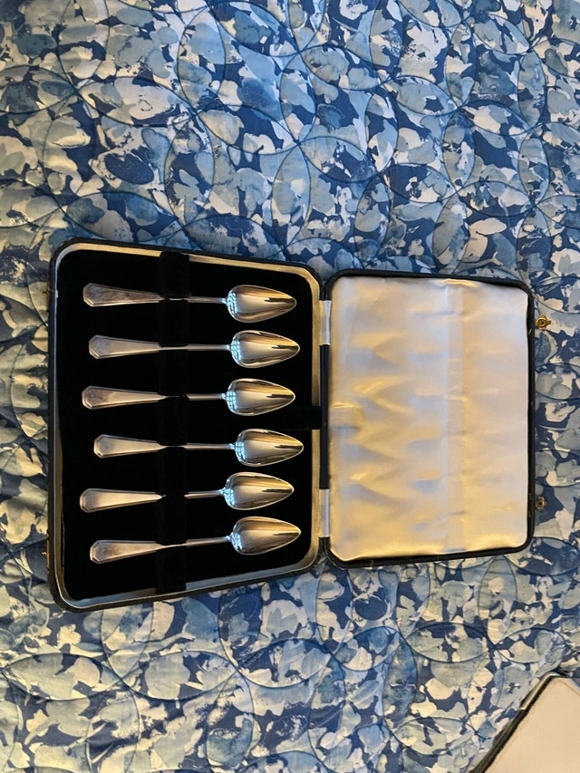Here are six antique silver spoons, perfect for adding a touch of elegance to your afternoon tea or collection! This set is in its original fitted case, although the silver does show some signs of age and use, which only adds to their vintage charm. Cash accepted.