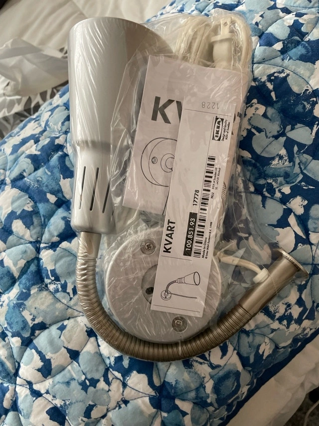 Illuminate your space with this new Ikea Kvart wall lamp, featuring a flexible arm for adjustable lighting. This sleek, silver-tone lamp is perfect for bedside reading or accent lighting, and it's still sealed in its original packaging, ensuring it's in pristine condition. Adjustable Arm: Direct light where you need it most. Condition: New, in original packaging. Colour: Silver-tone. Looking at similar Kijiji listings, a fair price for this lamp is $20. If the ad is up, the lamp is available.