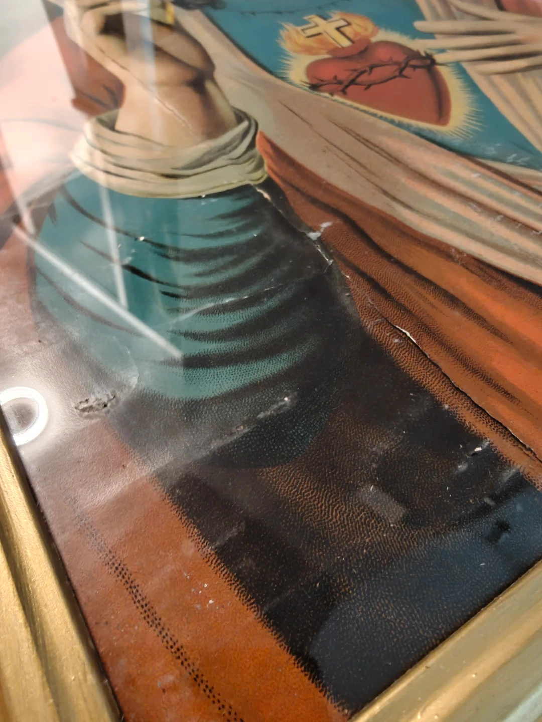 Very old and fragile print, the frame has been painted gold. The print has not been removed from the frame and shows the age of the print. Refer to the closeup pictures.