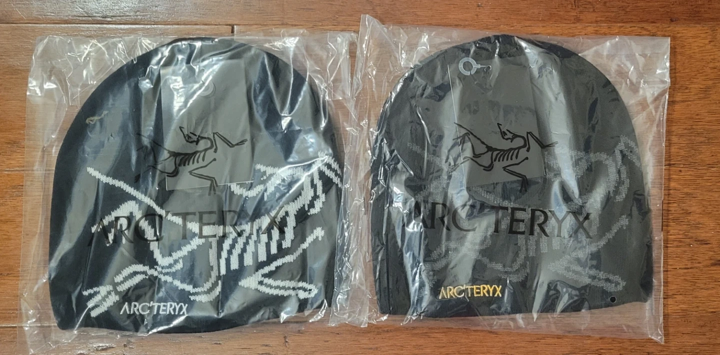 Selling two brand new Arc'teryx beanies, still in their original packaging. They're black with a distinctive white knit design and the Arc'teryx logo. These hats are perfect for staying warm during colder weather.