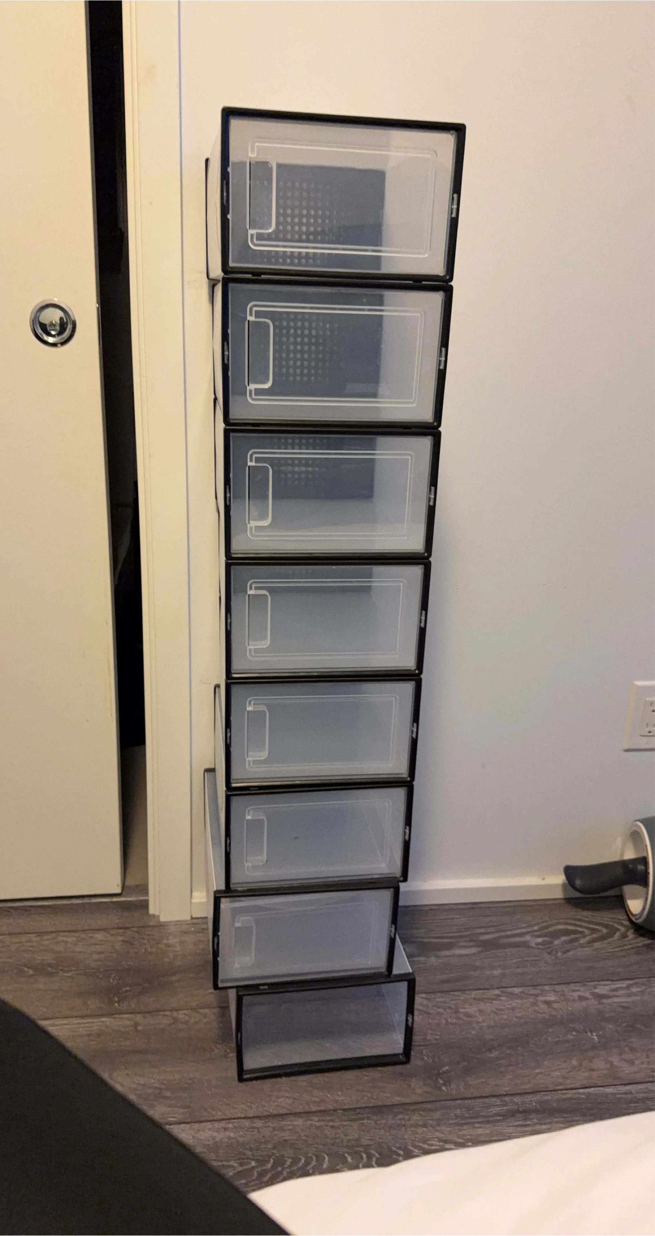 These are 8 stackable storage boxes for shoes or other items. They're made of clear plastic and black framing. The dimensions appear to be standard sneaker size.