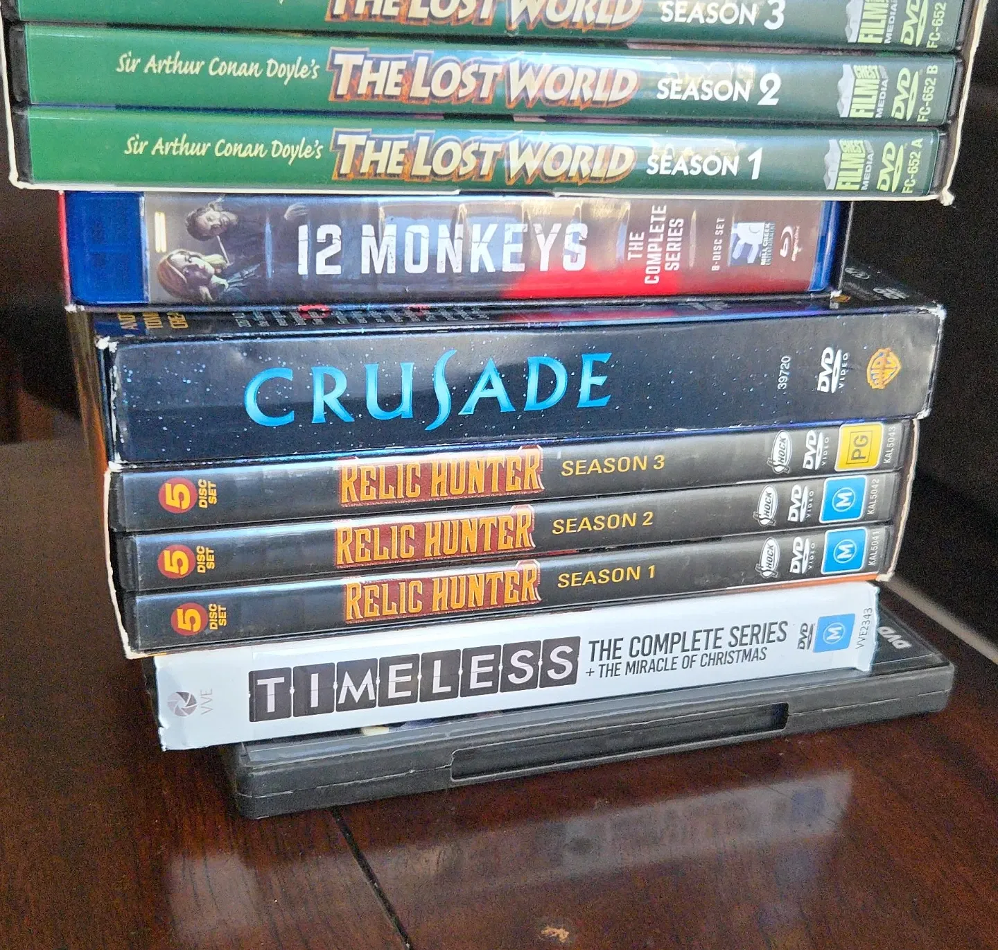 Collection of complete series and seasons of TV shows on DVD. Includes Sir Arthur Conan Doyle's The Lost World Seasons 1-3, Crusade, Relic Hunter Seasons 1-3, 12 Monkeys (8-disc set), and Timeless: The Complete Series + The Miracle of Christmas. All discs appear to be in cases.