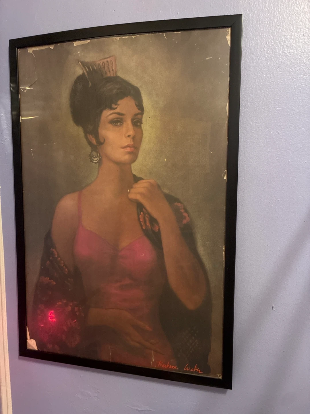 This is a painting by Barbara Weber. It depicts a woman in a pink dress and a patterned shawl. The artwork is framed. If you search you can find this painting being sold for $400-$600