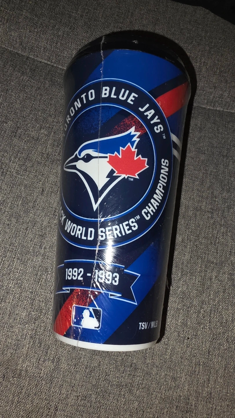 This is a Toronto Blue Jays cup celebrating their 1992-1993 World Series championships. It features the team logo and relevant dates.