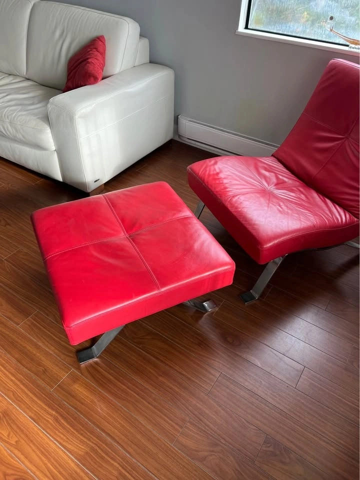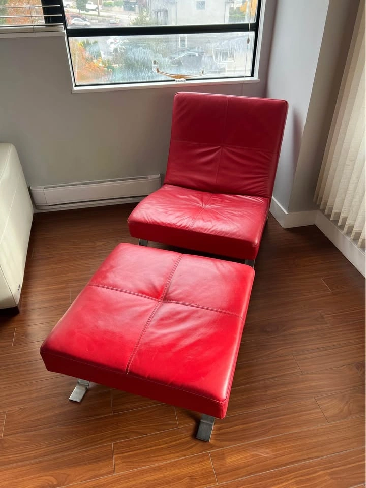 Made in Canada β Real Leather β Modern Style. Chair dimensions: 31.5β H x 26.5β W x 21.5β D. Ottoman dimensions: 26.5β W x 26.3β D x 13β H. This striking red leather lounge chair with matching ottoman is a great accent piece with solid metal legs and quality Canadian craftsmanship. Perfect for a living room, reading nook, office, or stylish space. Condition: Good used condition (normal light wear). Asking $950 OBO.