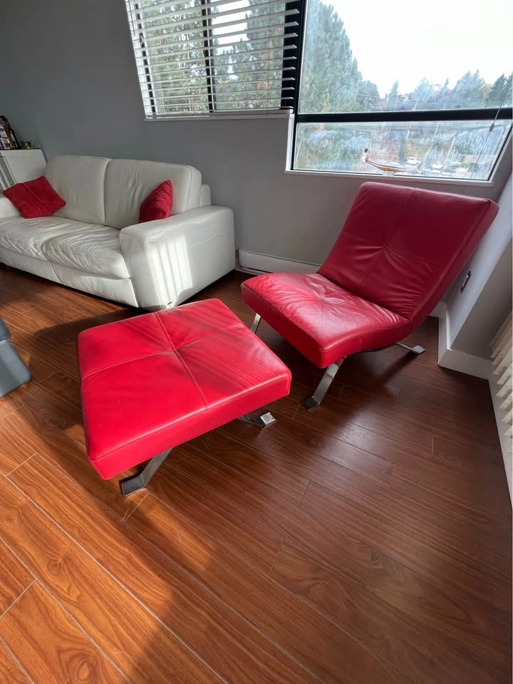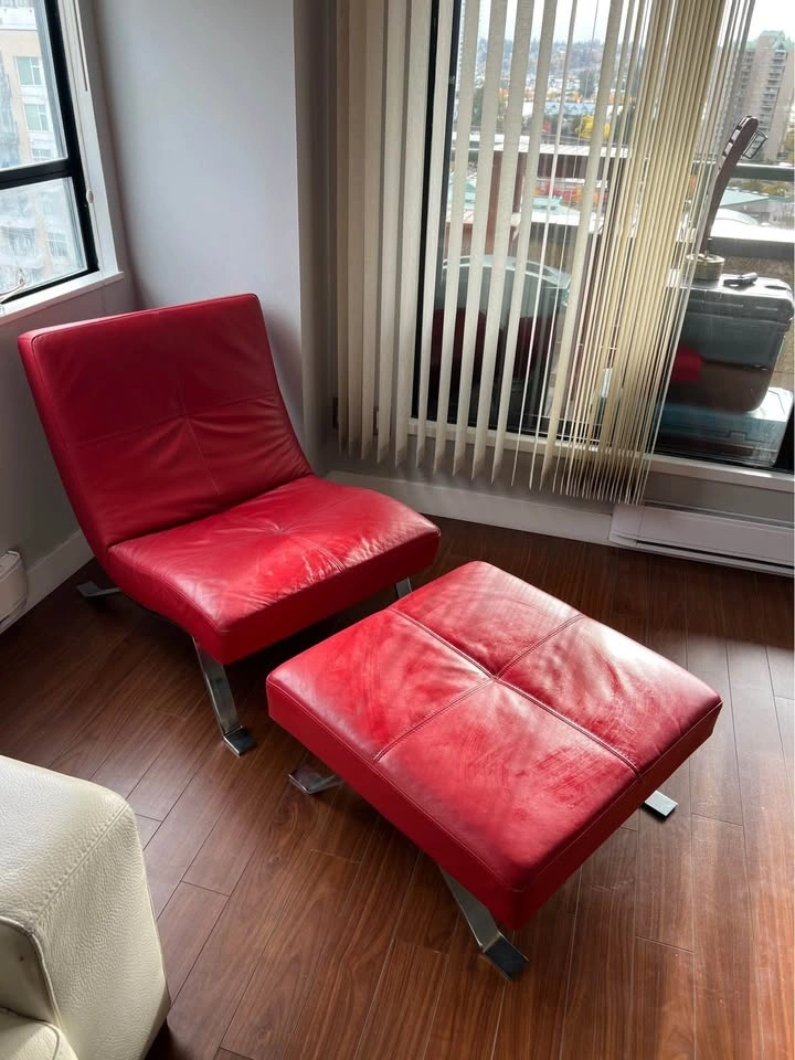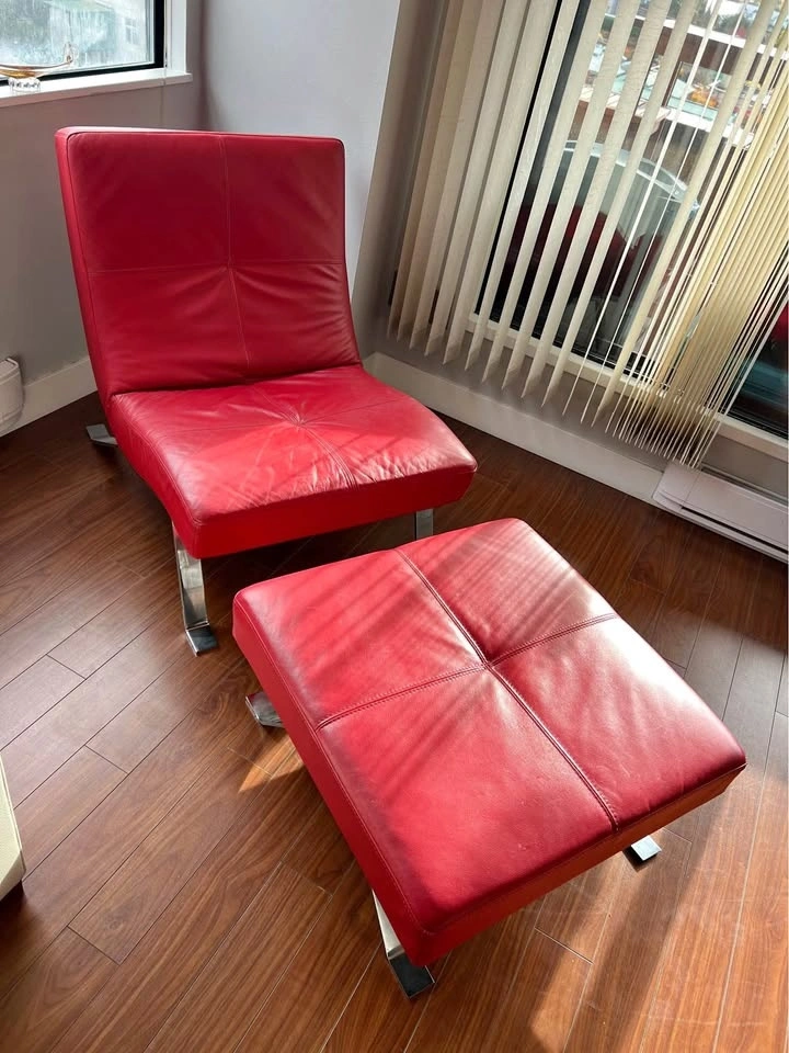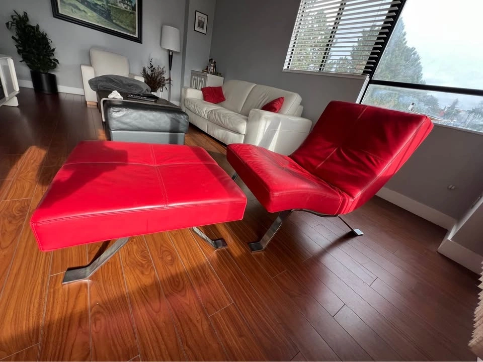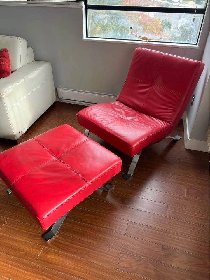 Made in Canada β Real Leather β Modern Style. Chair dimensions: 31.5β H x 26.5β W x 21.5β D. Ottoman dimensions: 26.5β W x 26.3β D x 13β H. This striking red leather lounge chair with matching ottoman is a great accent piece with solid metal legs and quality Canadian craftsmanship. Perfect for a living room, reading nook, office, or stylish space. Condition: Good used condition (normal light wear). Asking $950 OBO.