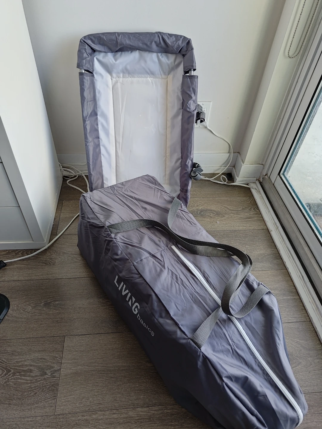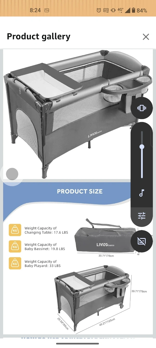 This LIVINGbasics playard comes with a bassinet and changing table attachments. It's easy to fold and includes a carrying bag. Weight capacity for changing table is 17.6 lbs, bassinet 19.8 lbs, and playard 33 lbs.