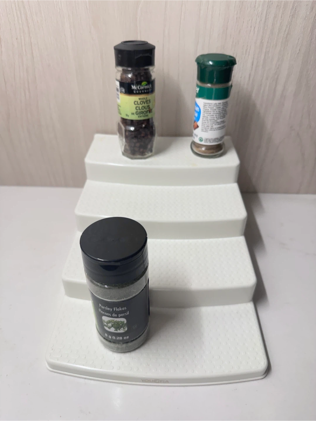 This is a white 4-tier stepped organizer for spices and jars. It's made of plastic with a textured surface. It helps you see and access your spices easily!