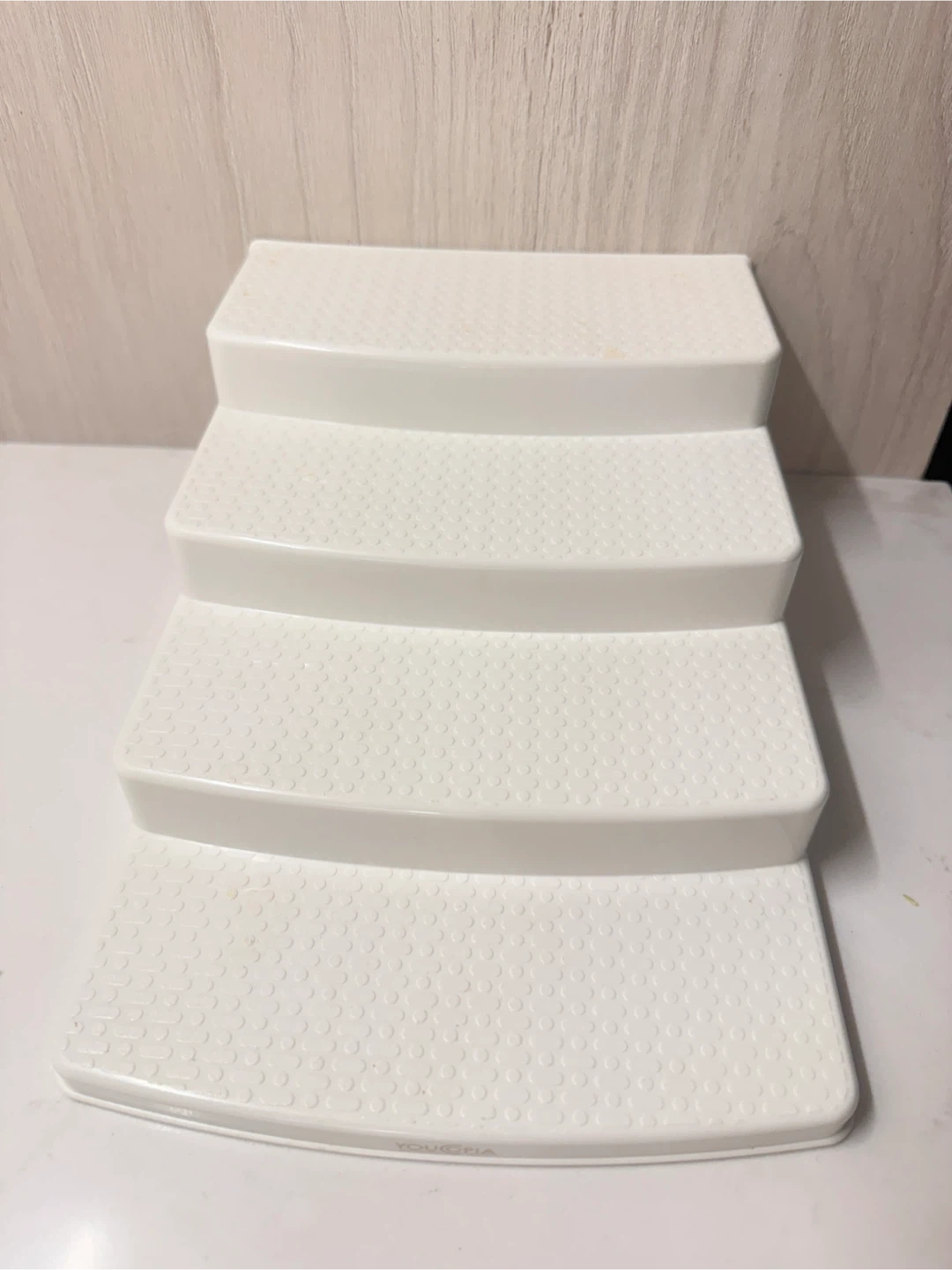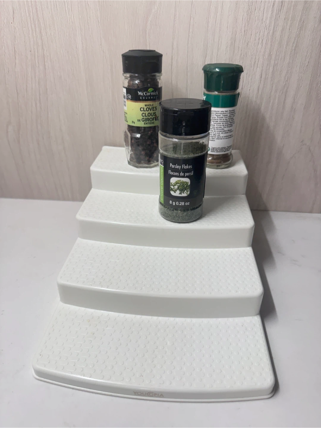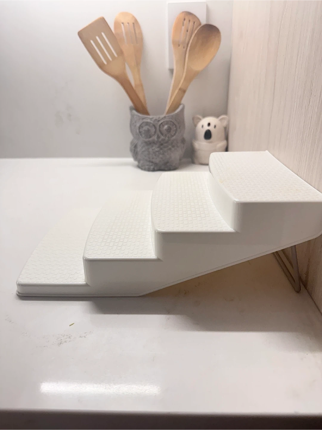 This is a white 4-tier stepped organizer for spices and jars. It's made of plastic with a textured surface. It helps you see and access your spices easily!