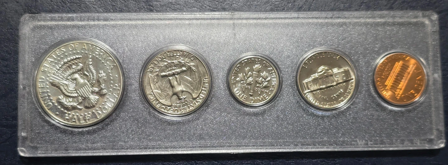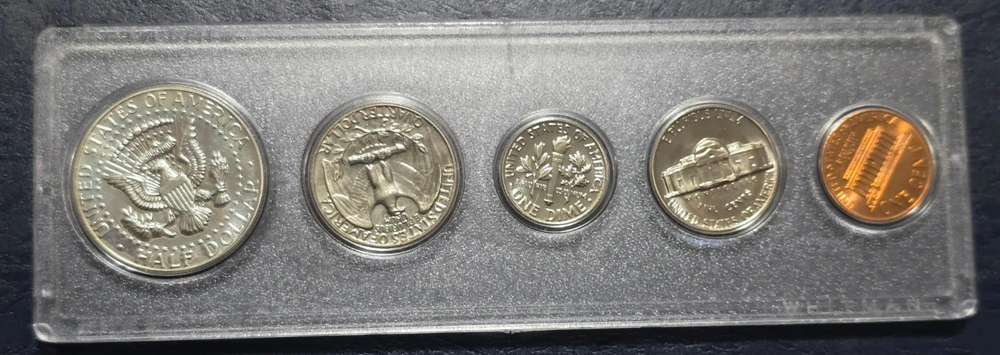 This is a set of five US coins from 1967. It includes a Kennedy Half Dollar(40% silver), a Washington Quarter, a Roosevelt Dime, a Jefferson Nickel, and a Lincoln Penny. The coins are encased in a clear plastic holder.