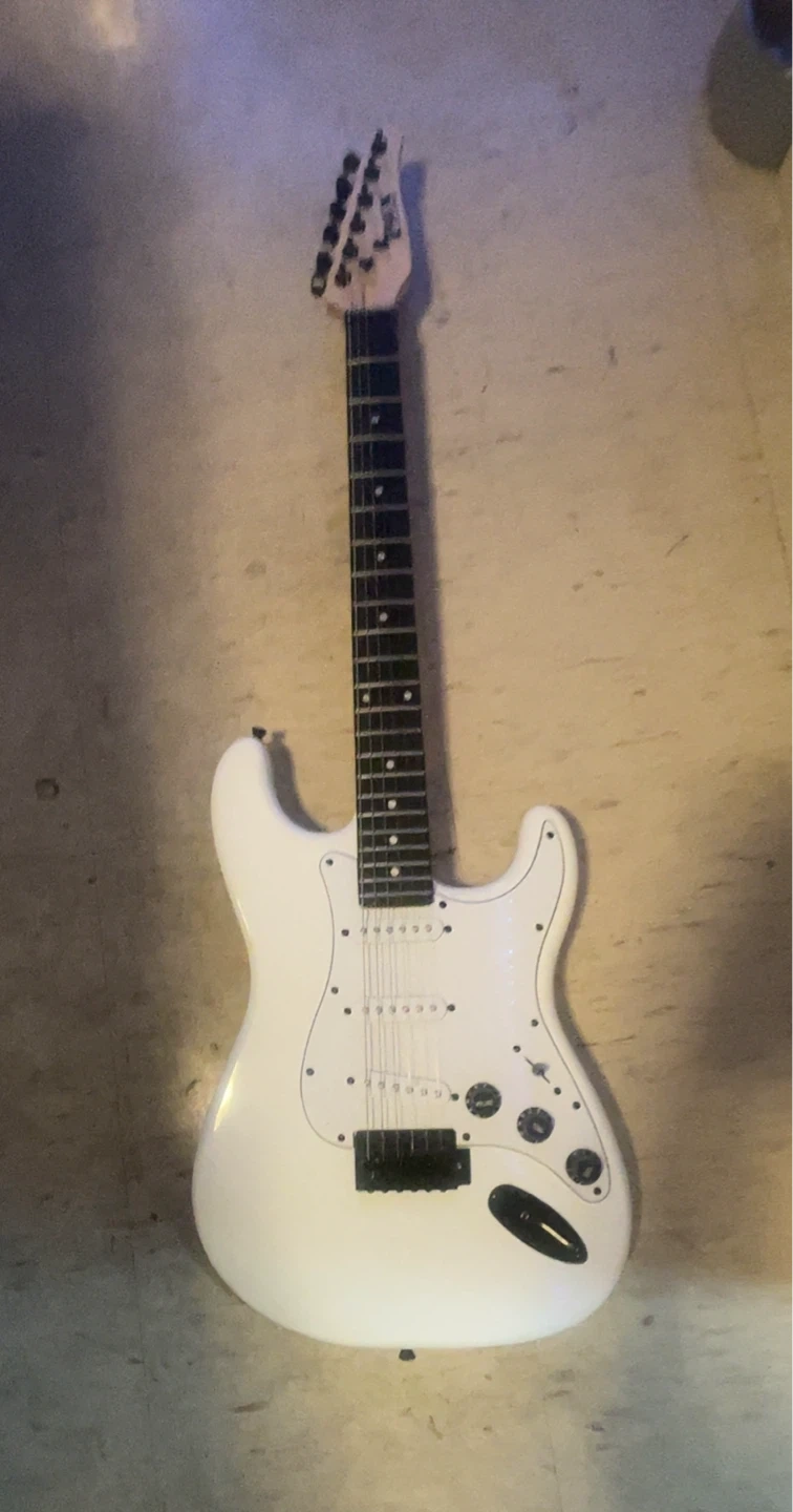 A white electric guitar with a rosewood fretboard. It's equipped with three single-coil pickups and a tremolo system. It's a classic style guitar that's good for learning or playing around. This would be great for a beginner guitarist!