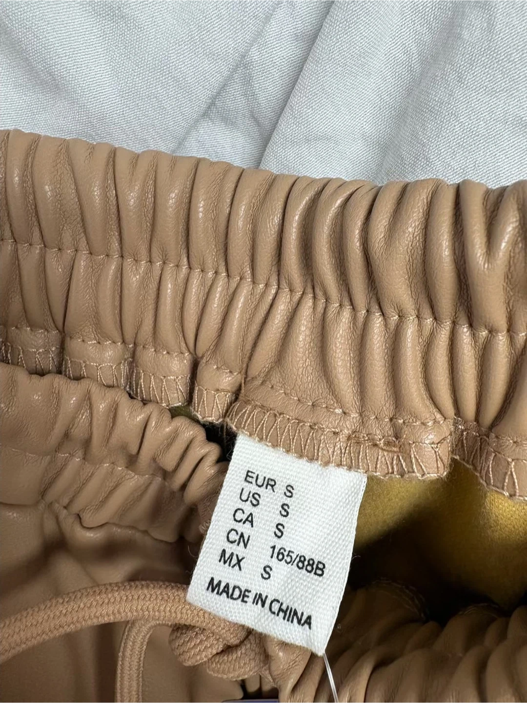 These Floema joggers are made of a faux leather material in a tan colour. They're a size small with an elasticated waistband and drawstring. Elasticated cuffs too! Size small pick up cash only