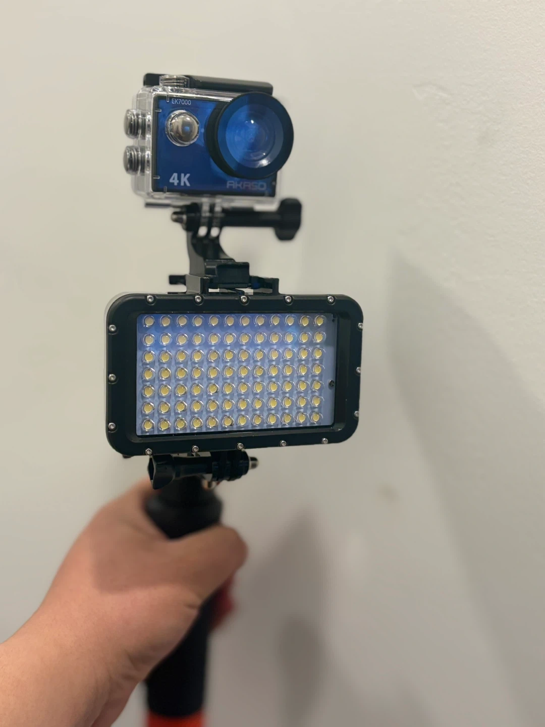 This AKASO action camera shoots in 4K resolution and comes with a bright LED light for better footage. It's mounted on a handle for steady shooting. The camera records video and has a waterproof casing.