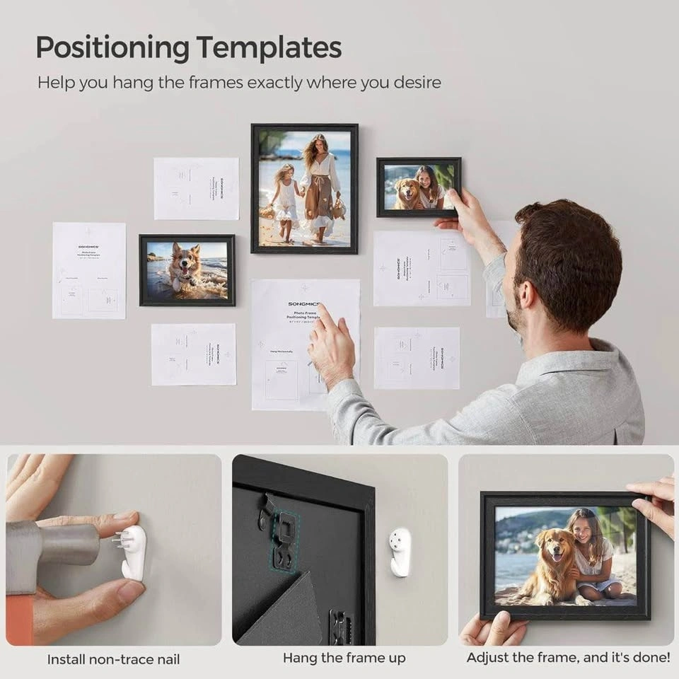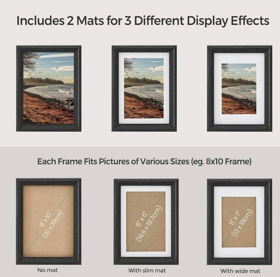 Brand new SONGMICS collage picture frames in elegant ash black. This set includes 10 frames with 16 mats: 2 for 8x10, 4 for 5x7, and 4 for 4x6 photos. Perfect for creating a stylish wall collage or displaying individually around your home.