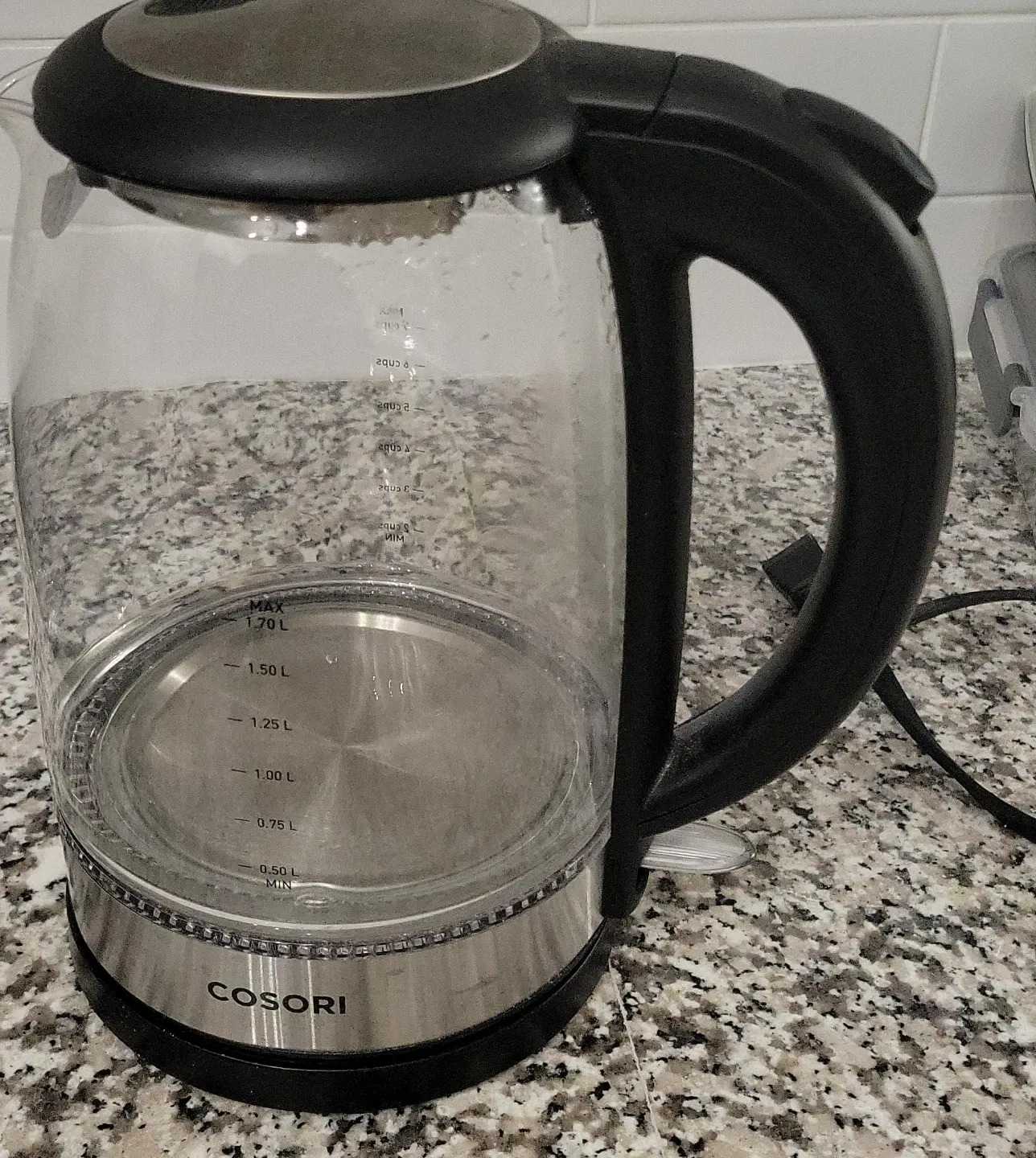 This is a COSORI electric kettle with a 1.7L capacity. It's made of glass and has a stainless steel base. The markings inside show measurements in litres. It has a max fill line of 1.70L and a min fill line of 0.50L. Perfect for boiling water quickly!