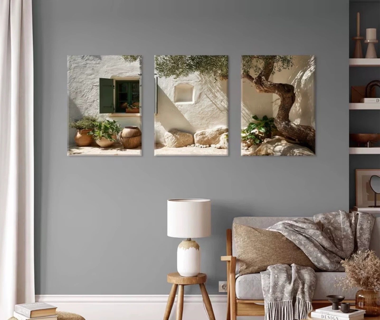 Set of three canvas prints featuring scenic Mediterranean courtyard views with rustic elements like potted plants and stone architecture. Each piece showcases charming outdoor vignettes that evoke a sense of tranquility. This artwork's design is great for adding a touch of European charm to any room.
