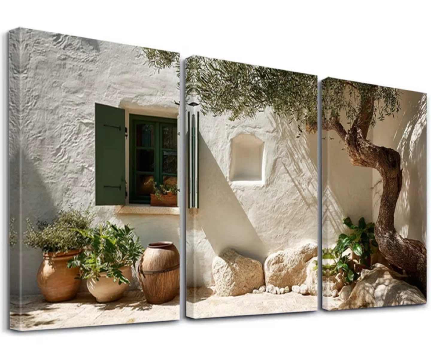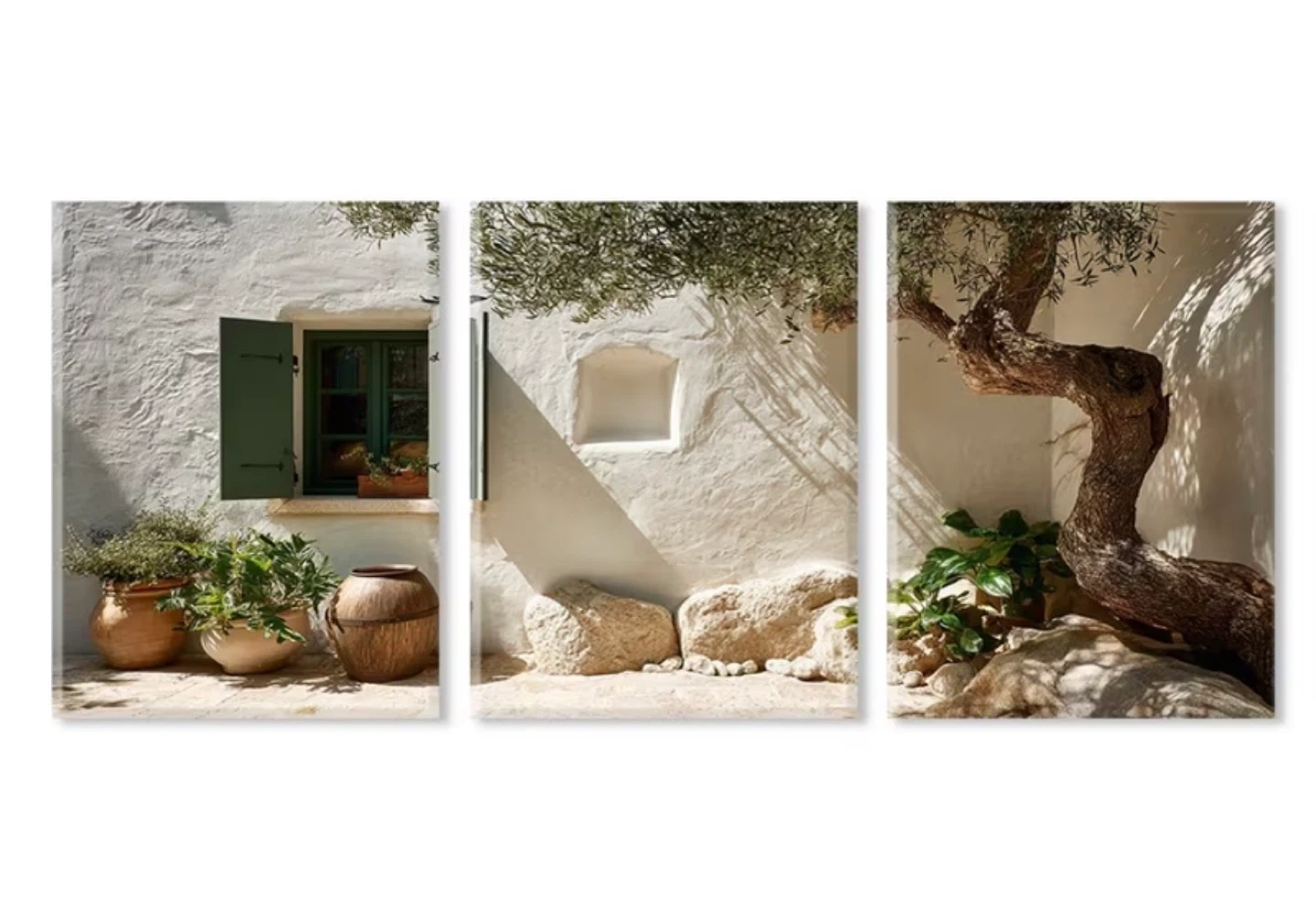 Set of three canvas prints featuring scenic Mediterranean courtyard views with rustic elements like potted plants and stone architecture. Each piece showcases charming outdoor vignettes that evoke a sense of tranquility. This artwork's design is great for adding a touch of European charm to any room.