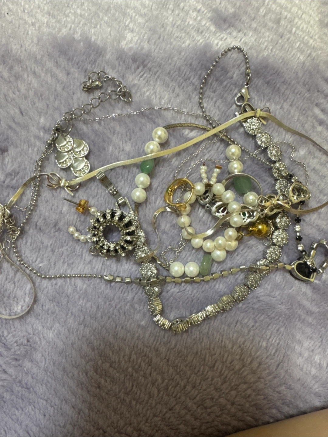 A collection of costume jewellery pieces. Includes necklaces, bracelets, rings, and earrings. Materials appear to be mixed metals and faux pearls.