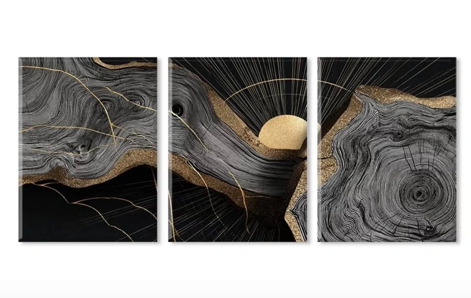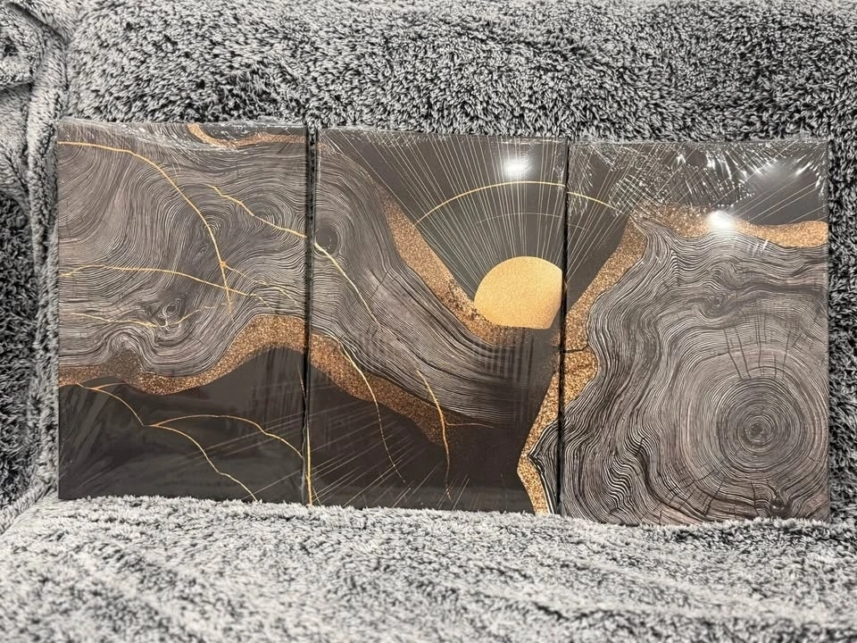 Set of 3 framed modern abstract canvas paintings. Features golden lines and dark-toned textured waves. Great for living room, bedroom, or kitchen decor. Makes a nice gift.