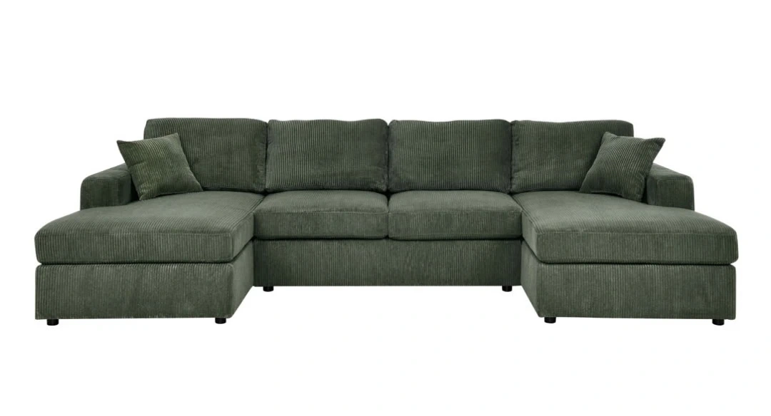 Comfortable green corduroy sectional sofa. Features a U-shaped design with multiple seating areas and includes matching throw pillows. Brand new and Unopened (the couch shown is for reference only).