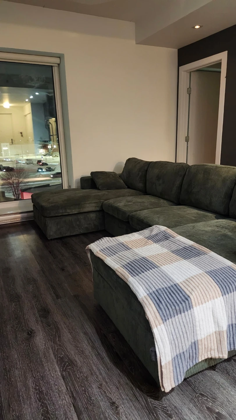 Comfortable green corduroy sectional sofa. Features a U-shaped design with multiple seating areas and includes matching throw pillows. Brand new and Unopened (the couch shown is for reference only).