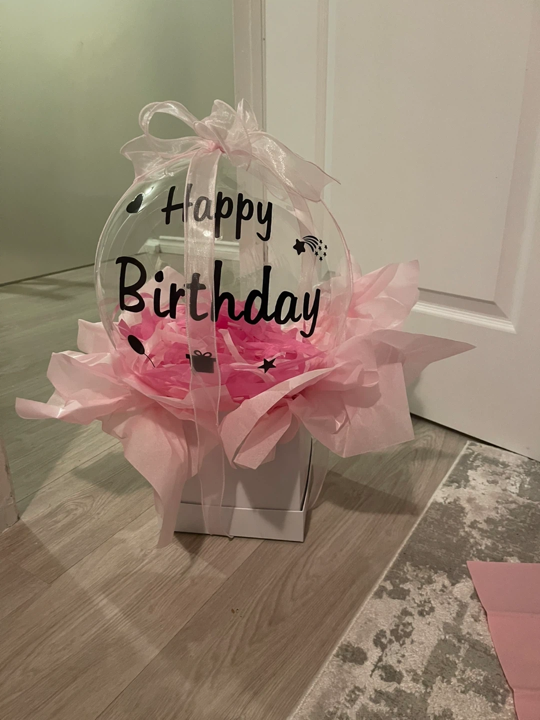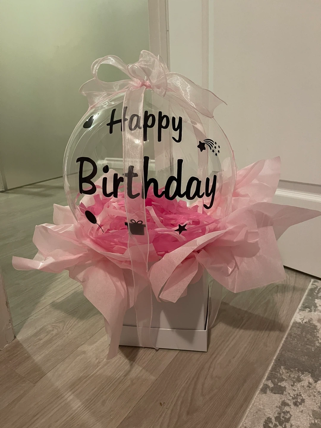 A clear bubble balloon with "Happy Birthday"