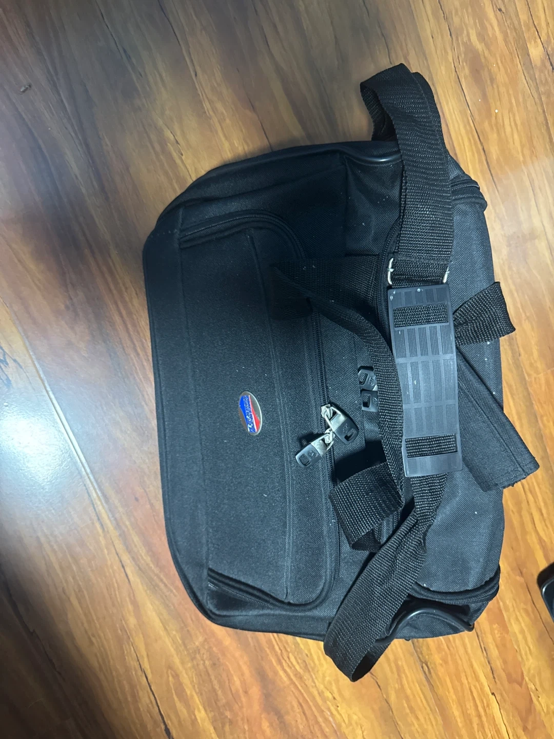 A black American Tourister duffle bag with a removable shoulder strap. It features a zippered main compartment and front pockets for organization. The bag's material appears to be durable polyester.