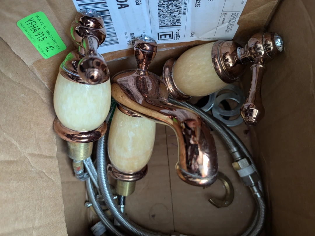 This is a lovely copper finish faucet with creamy marble-like stone. It's designed for a bathroom sink or tub. It's a beautiful piece to upgrade your washroom!