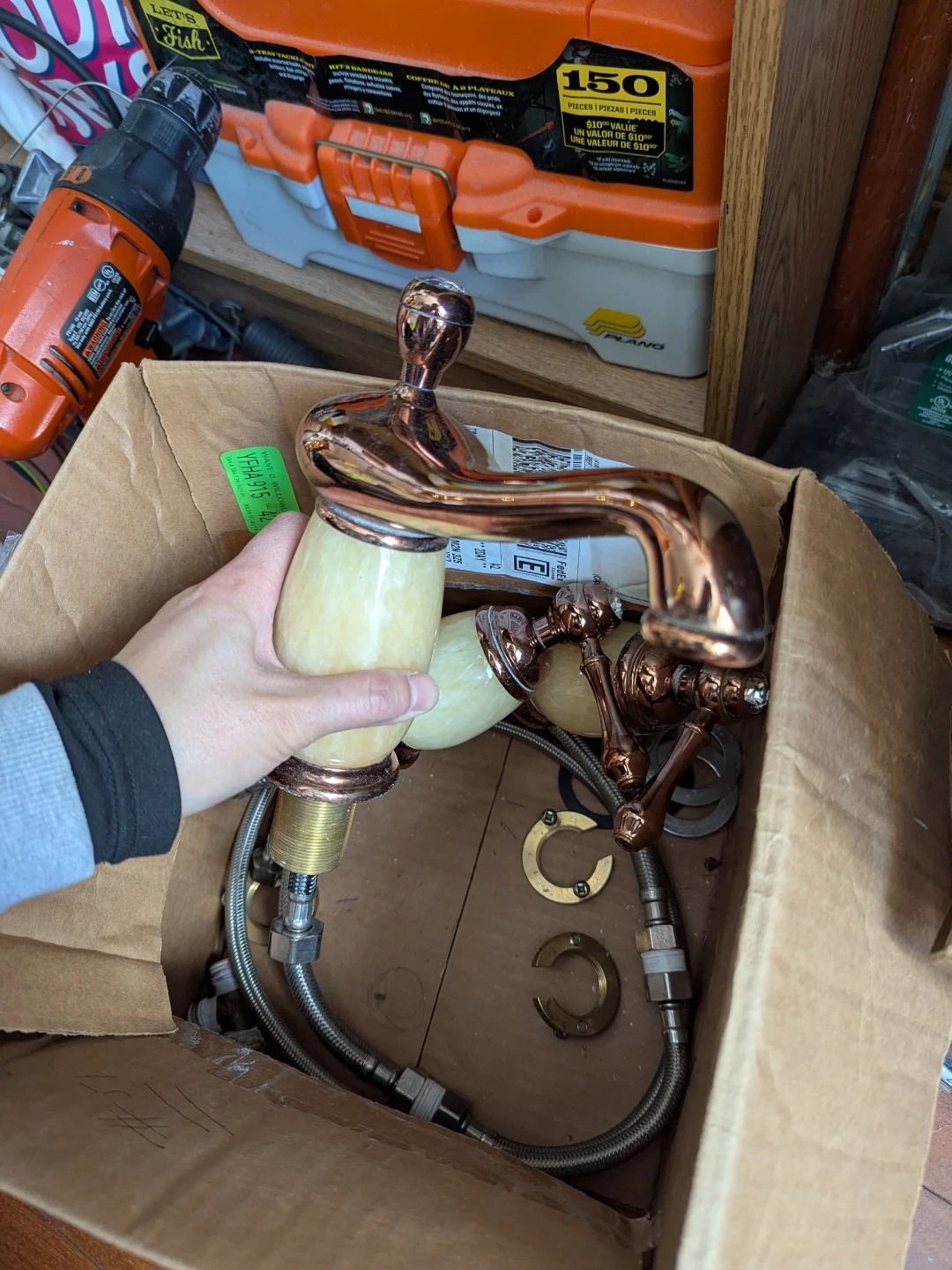 This is a lovely copper finish faucet with creamy marble-like stone. It's designed for a bathroom sink or tub. It's a beautiful piece to upgrade your washroom!
