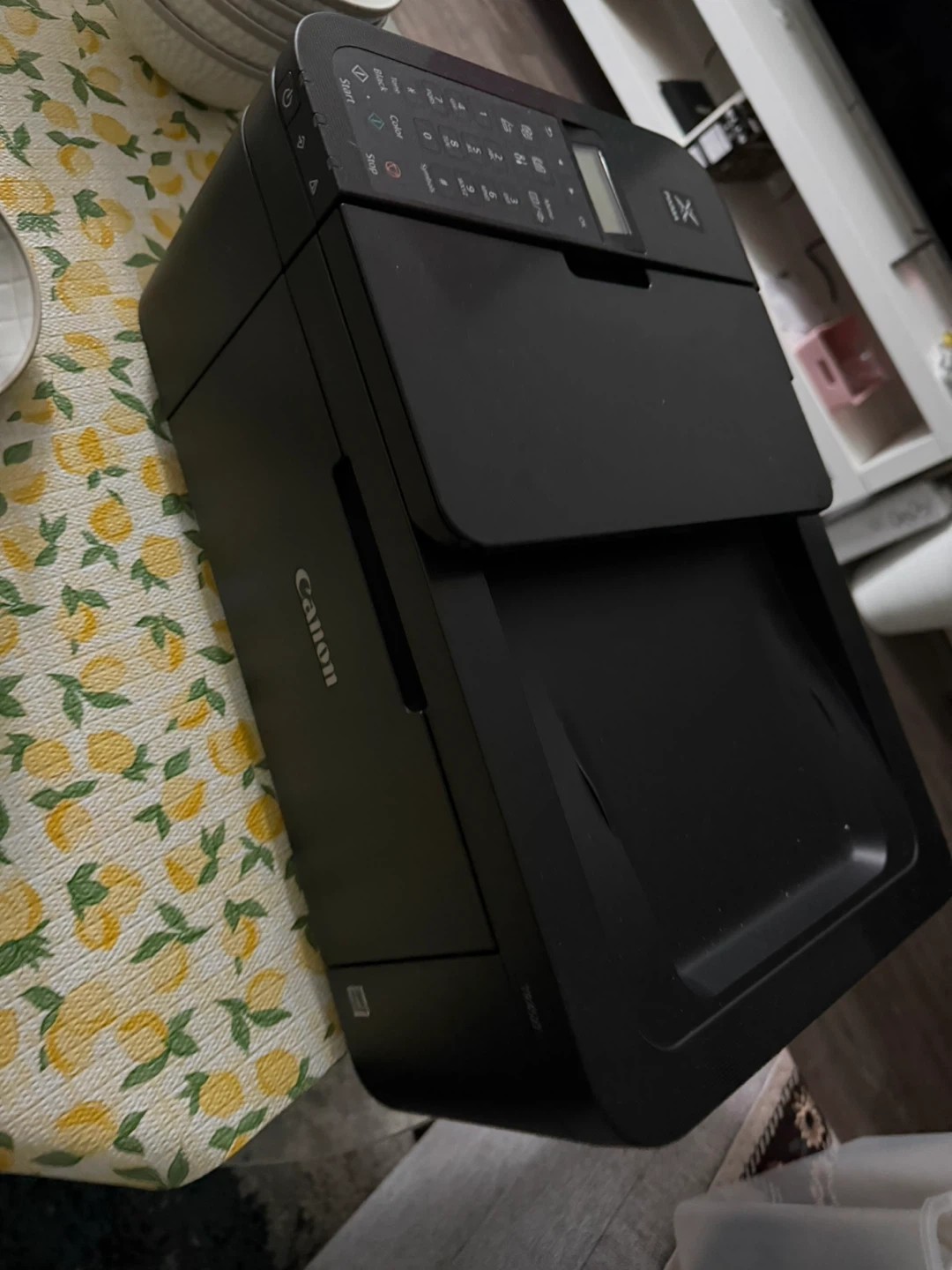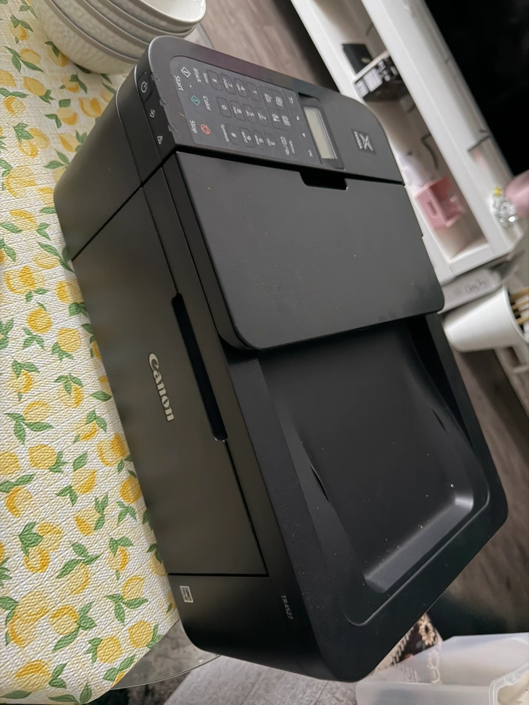 This is a black Canon PIXMA TR4527 All-in-One printer. It's capable of printing, copying, scanning, and faxing. This compact printer is suitable for home or small office use.